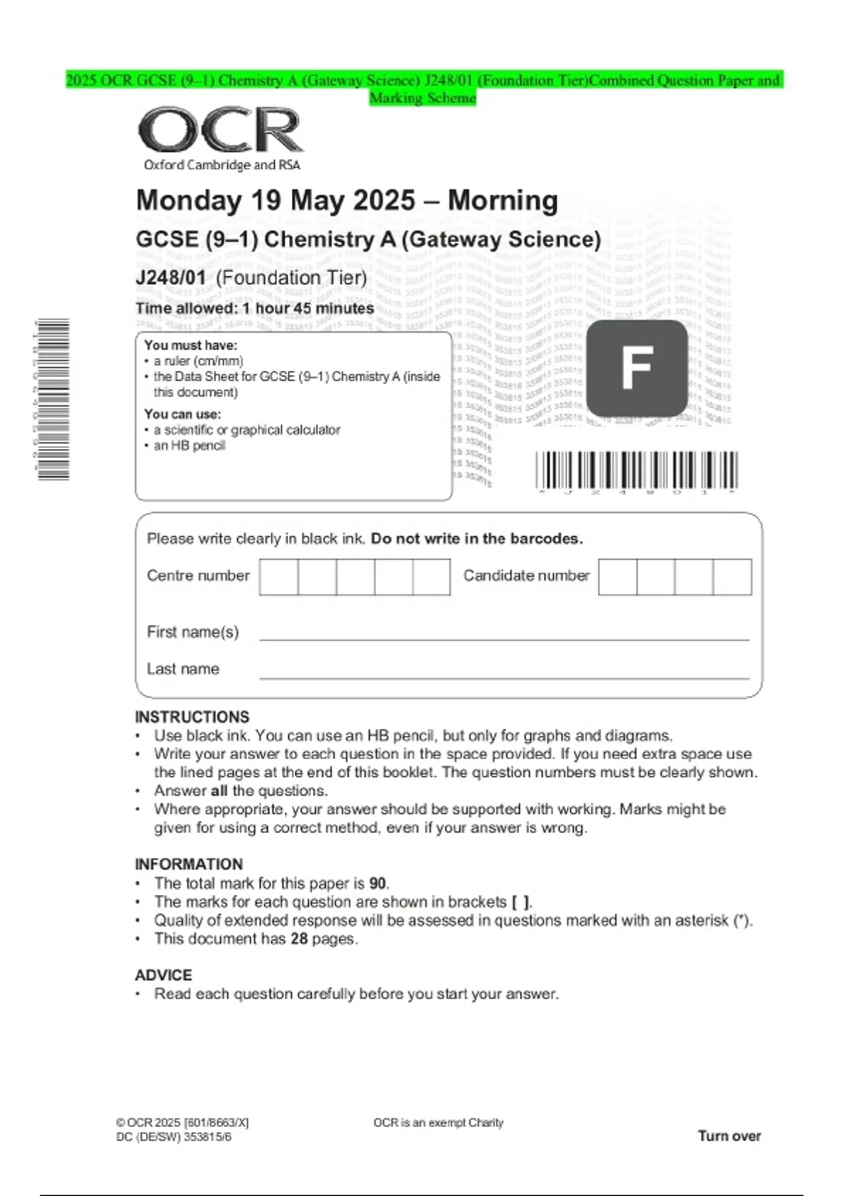 2025 OCR GCSE (9–1) Chemistry A (Gateway Science) J248/01 (Foundation Tier)Combined Question Paper and Marking Scheme