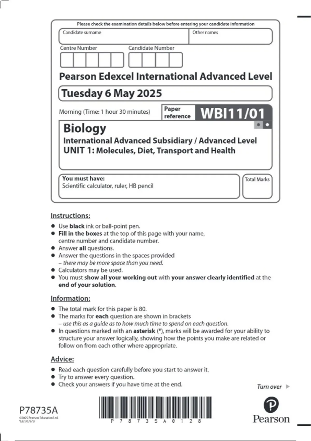 Pearson Edexcel International Advanced Subsidiary Level In Biology (WBI11) Paper 01 Molecules, Diet, Transport, and Health may 2025