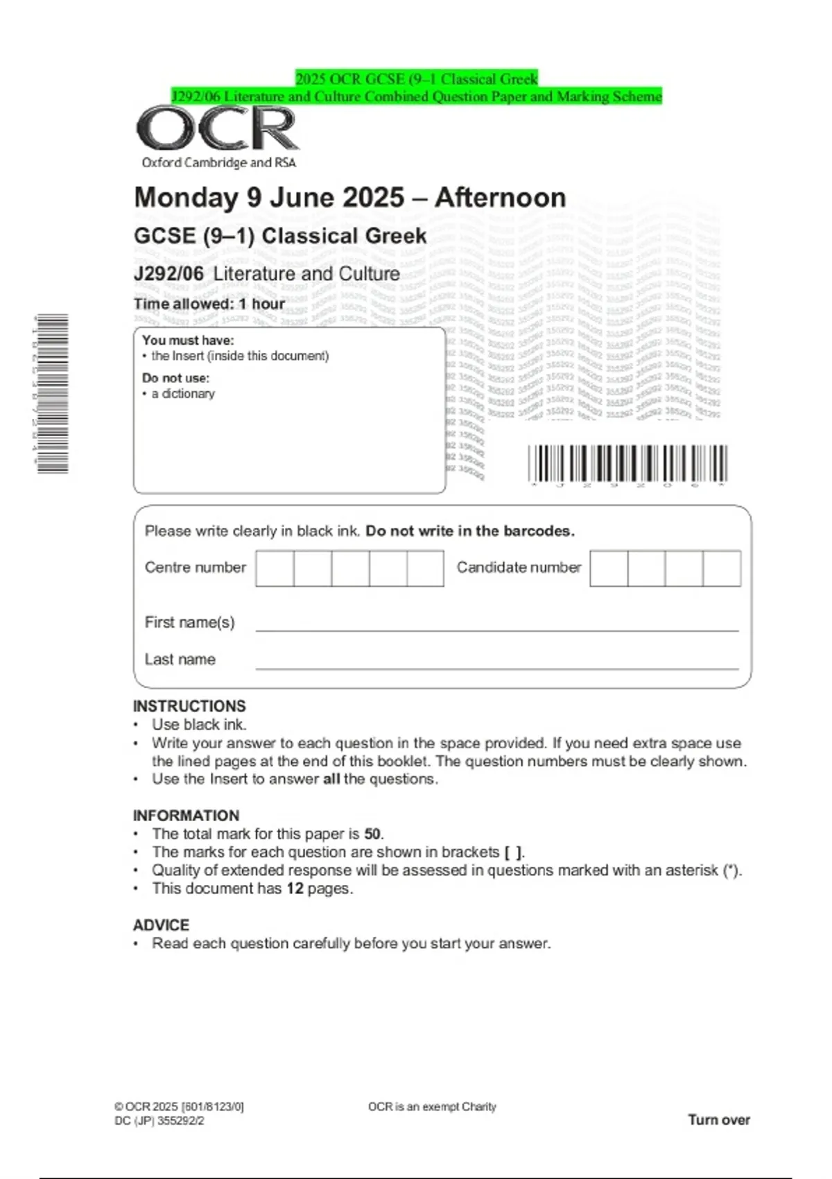 2025 OCR GCSE (9–1 Classical Greek J292/06 Literature and Culture Combined Question Paper and Marking Scheme