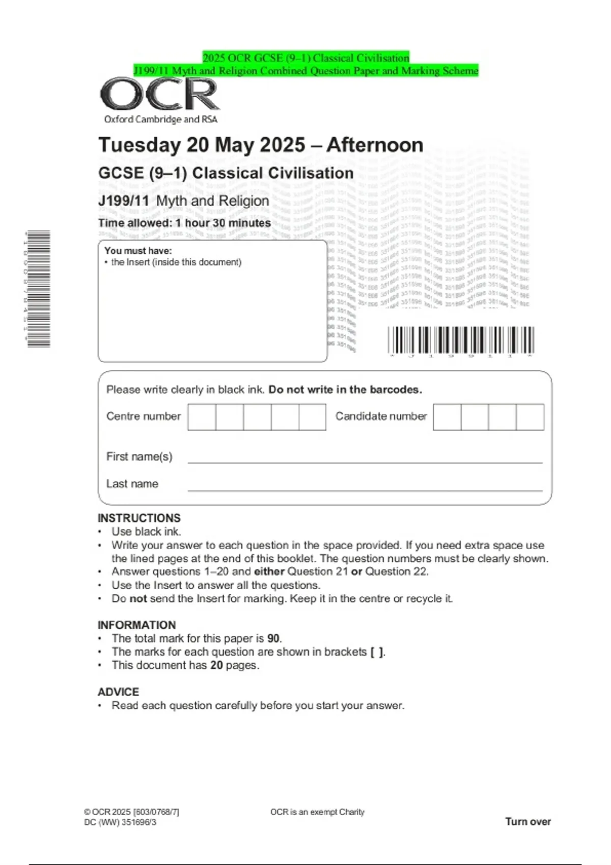 2025 OCR GCSE (9–1) Classical Civilisation J199/11 Myth and Religion Combined Question Paper and Marking Scheme