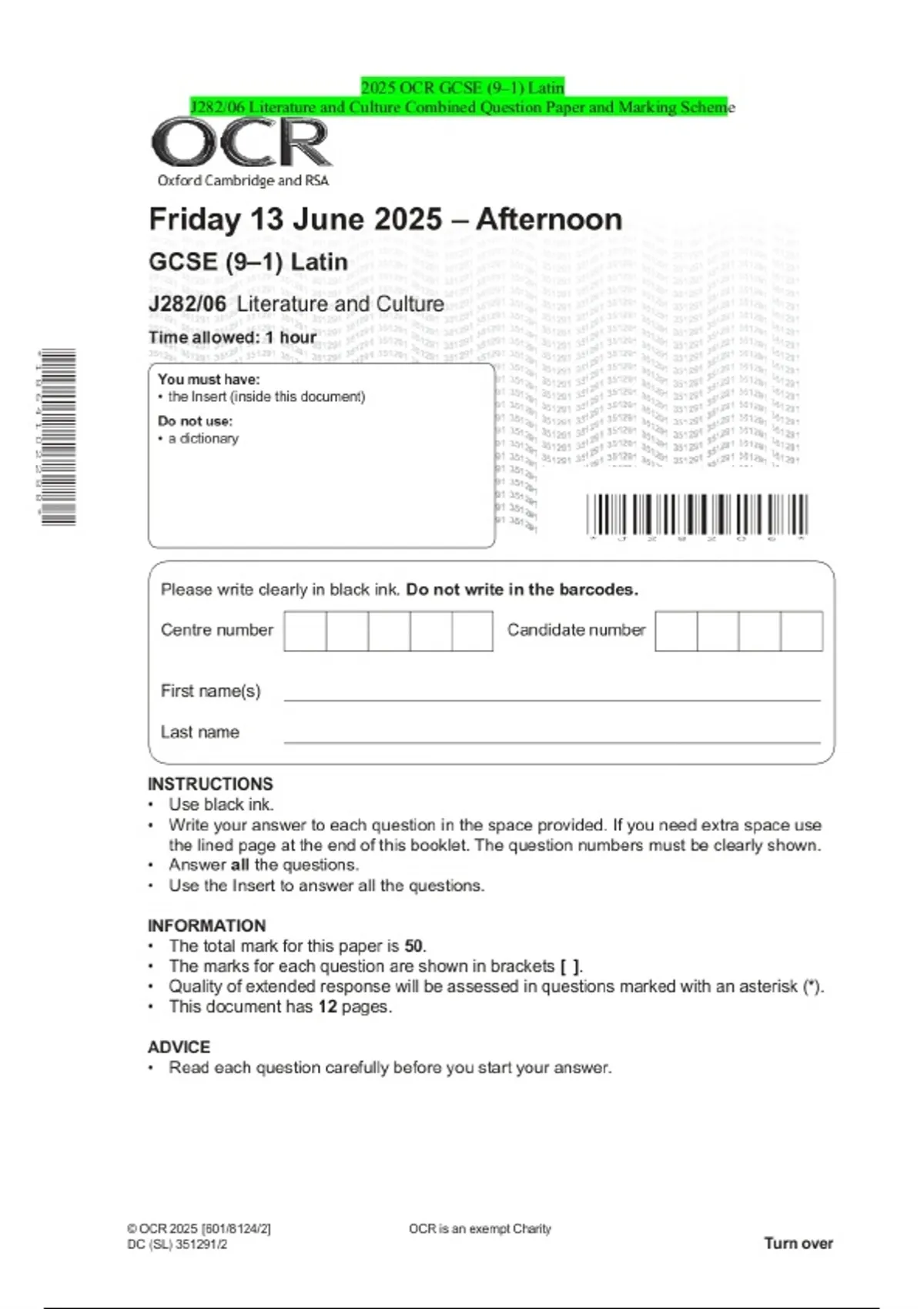 2025 OCR GCSE (9–1) Latin J282/06 Literature and Culture Combined Question Paper and Marking Scheme