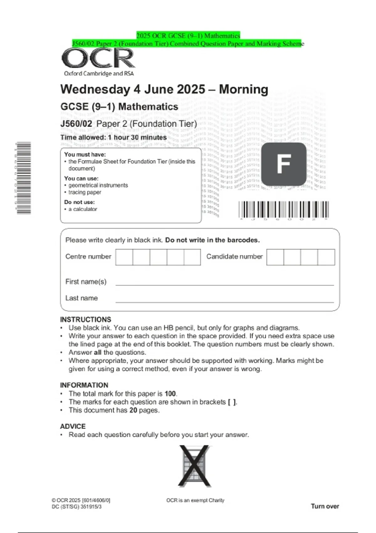 2025 OCR GCSE (9–1) Mathematics J560/02 Paper 2 (Foundation Tier) Combined Question Paper and Marking Scheme
