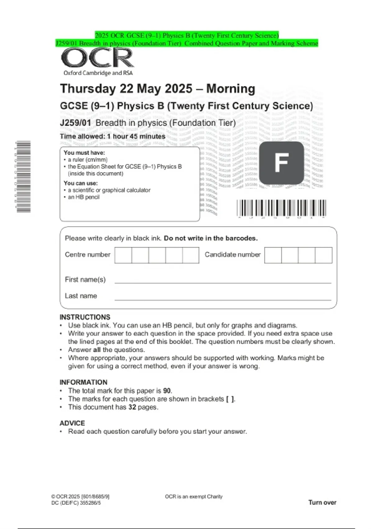 2025 OCR GCSE (9–1) Physics B (Twenty First Century Science) J259/01 Breadth in physics (Foundation Tier) Combined Question Paper and Marking Scheme