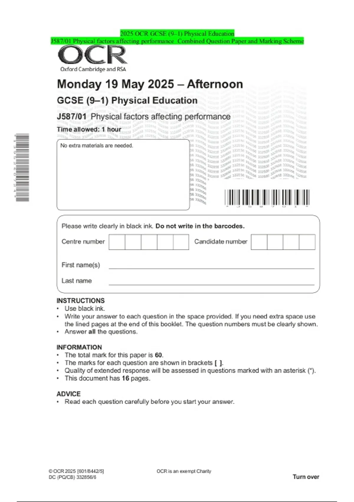 2025 OCR GCSE (9–1) Physical Education J587/01 Physical factors affecting performance Combined Question Paper and Marking Scheme