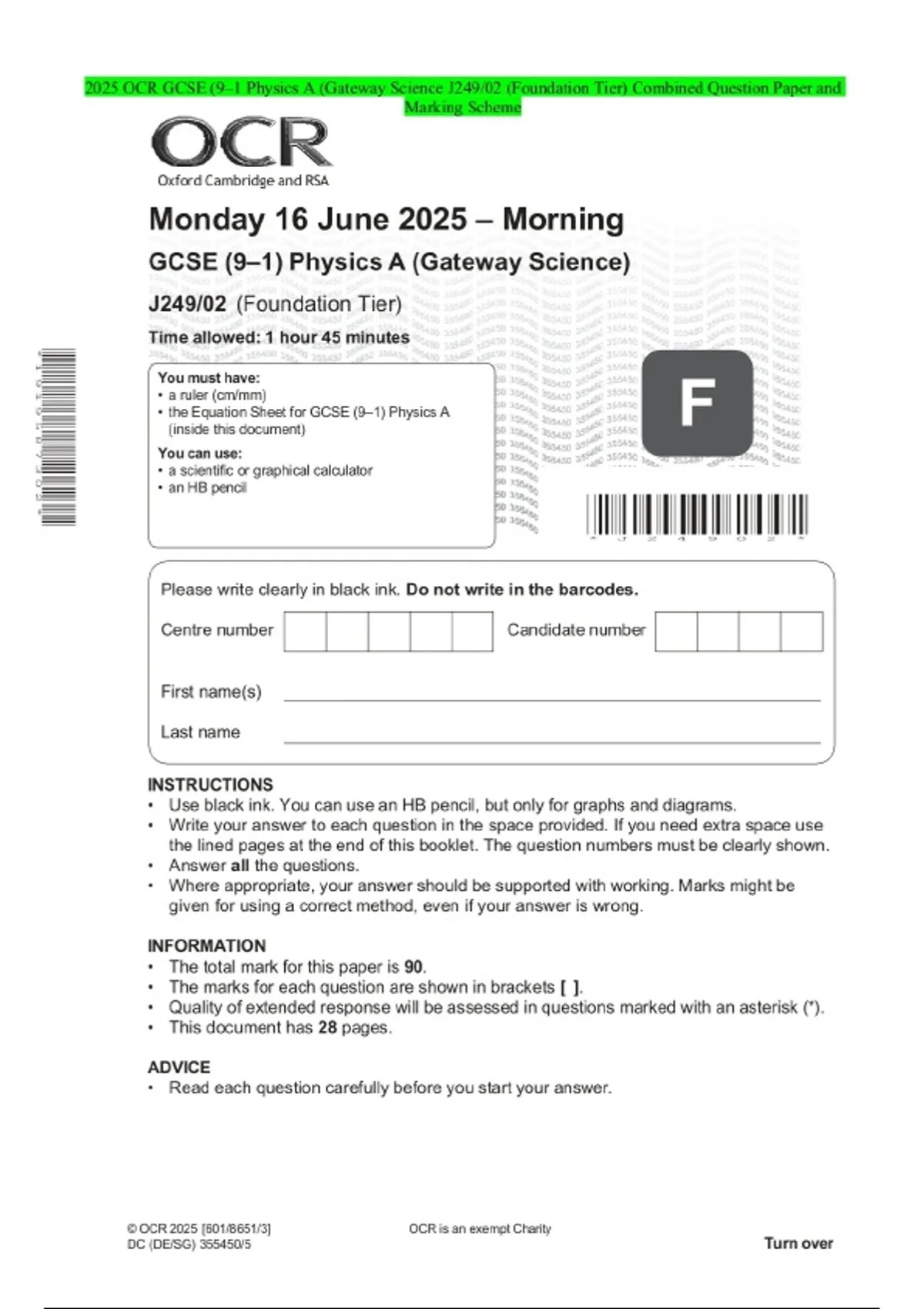 2025 OCR GCSE (9–1 Physics A (Gateway Science J249/02 (Foundation Tier) Combined Question Paper and Marking Scheme