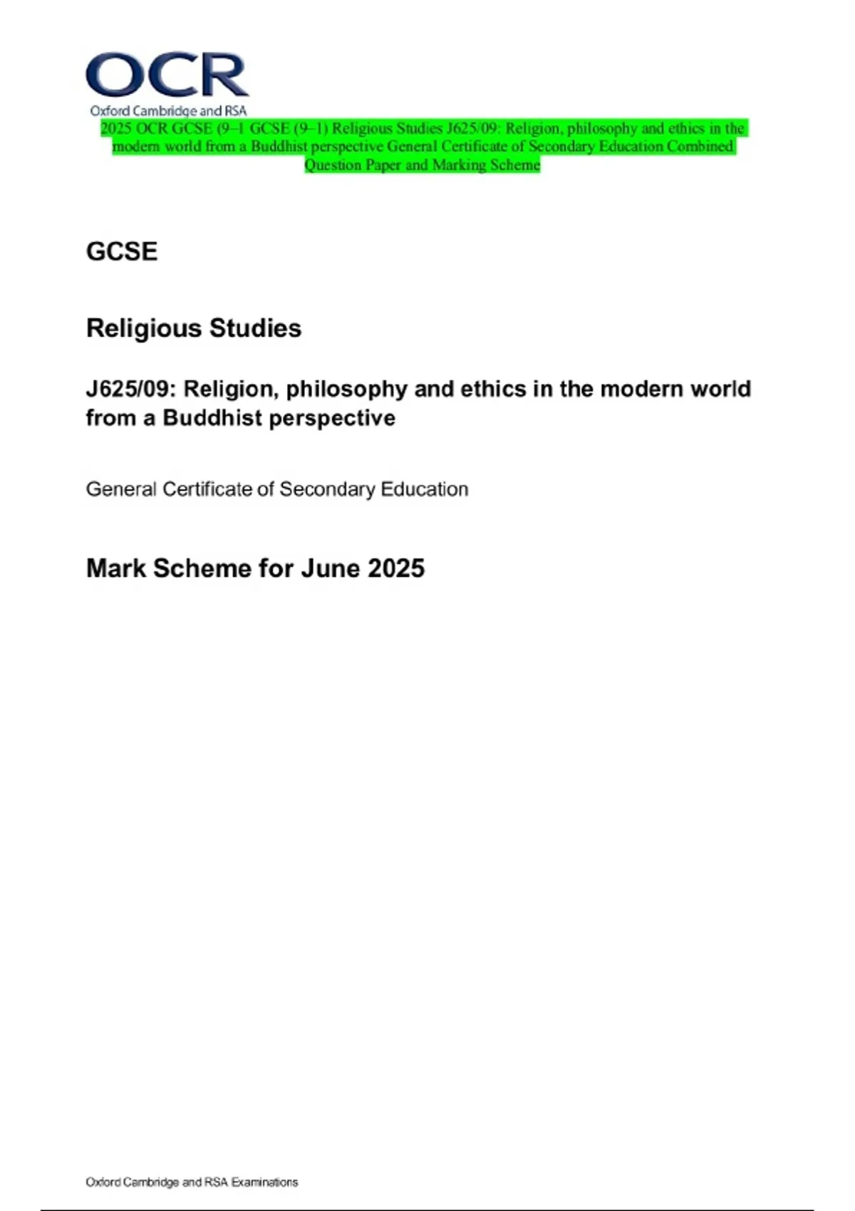 2025 OCR GCSE (9–1 GCSE (9–1) Religious Studies J625/09: Religion, philosophy and ethics in the modern world from a Buddhist perspective General Certificate of Secondary Education Combined Question Paper and Marking Scheme