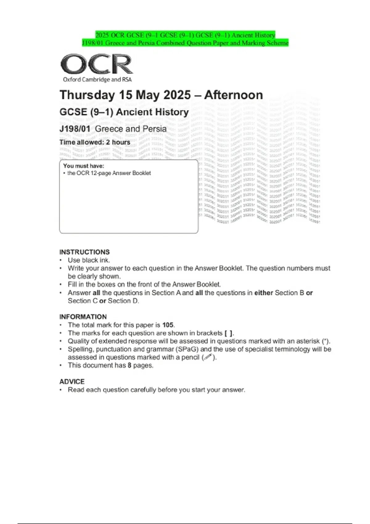 2025 OCR GCSE (9–1 GCSE (9–1) GCSE (9–1) Ancient History J198/01 Greece and Persia Combined Question Paper and Marking Scheme
