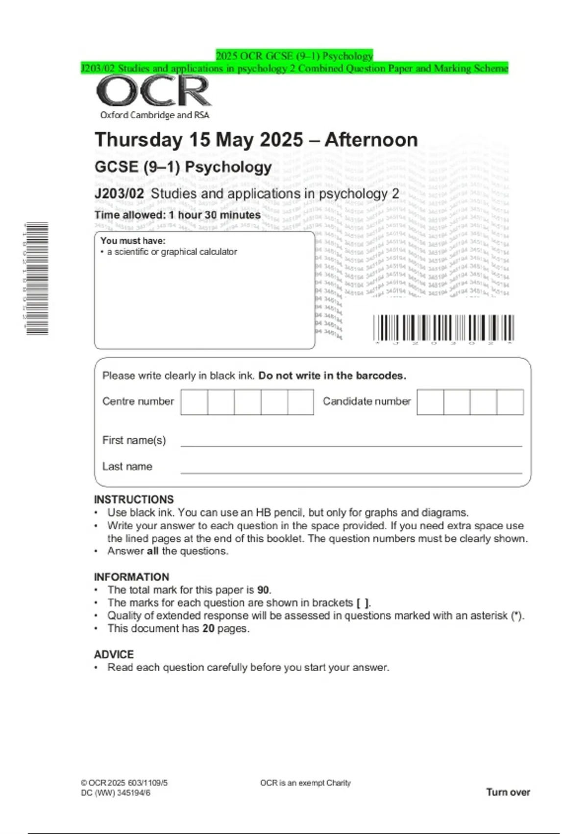 2025 OCR GCSE (9–1) Psychology J203/02 Studies and applications in psychology 2 Combined Question Paper and Marking Scheme