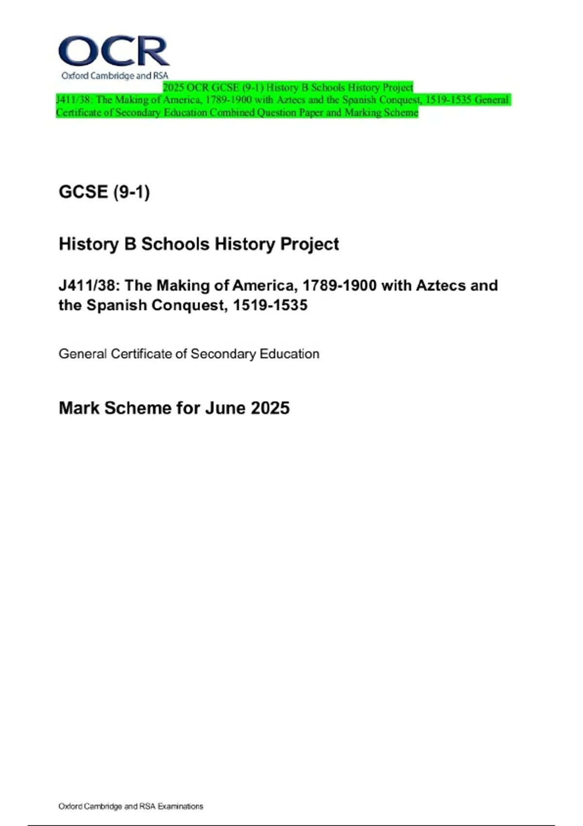2025 OCR GCSE (9-1) History B Schools History Project J411/38: The Making of America, with Aztecs and the Spanish Conquest, General Certificate of Secondary Education Combined Question Paper and Marking Scheme