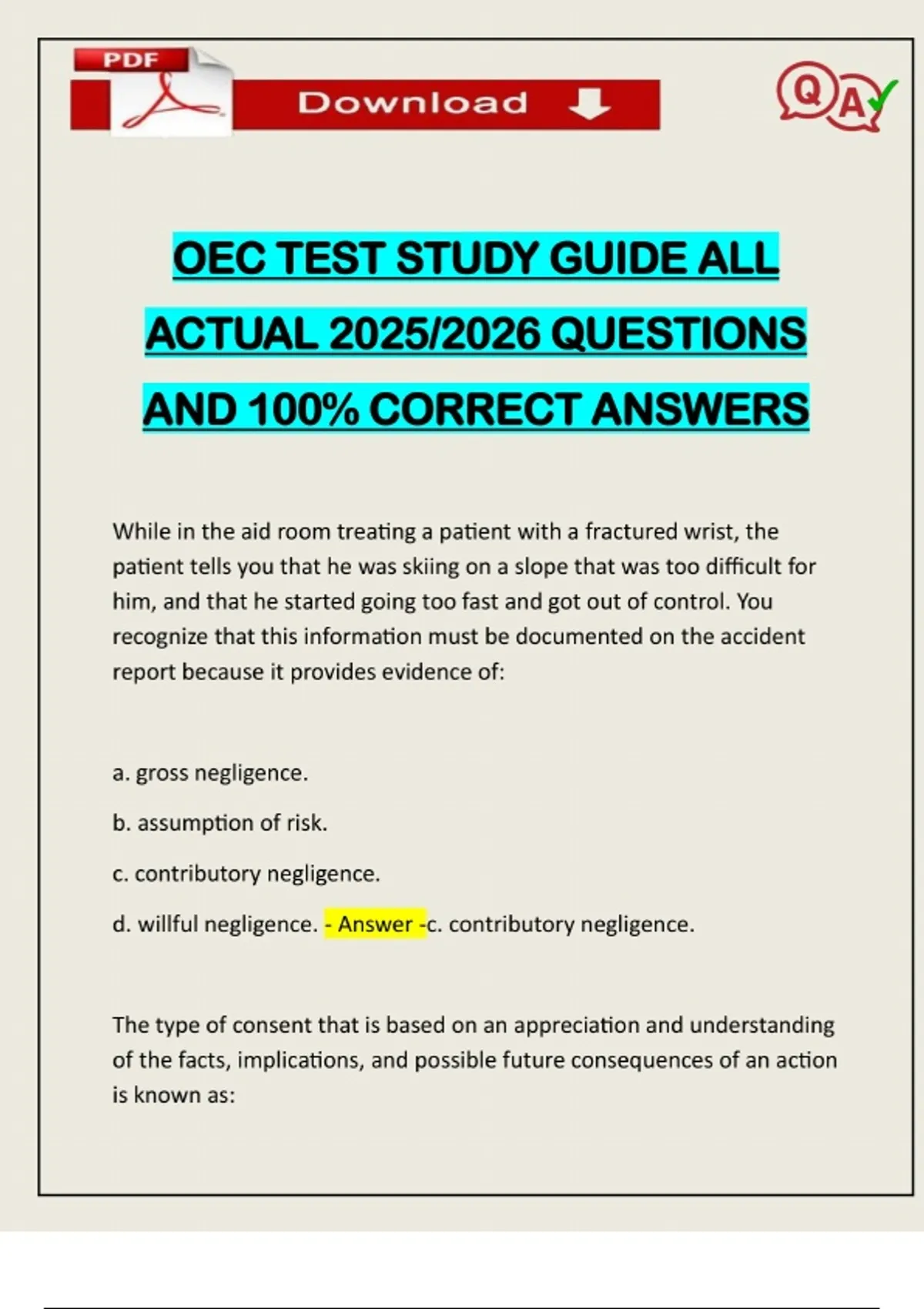 OEC TEST STUDY GUIDE ALL ACTUAL 2025/2026 QUESTIONS AND 100% CORRECT ANSWERS While in the aid room treating a patient with a fractured wrist, the patient tells you that he was skiing on a slope that was too difficult for him, and that he started going too fast and got out of control. You recognize that this information must be documented on the accident report because it provides evidence of: a. gross negligence. b. assumption of risk. c. contributory negligence. d. willful negligence. - Answer -c. contributory negligence. The type of consent that is based on an appreciation and understanding of the facts, implications, and possible future consequences of an action is known as:Need assistance on Online classes, Exams & Assignments? Reach out for instant help!! Full Course Assistance, Plagiarism-free Essay Writing, Research Paper, Dissertation, Discussion Posts, etc…. Confidential & Secure services. Tutors are available for all subjects! Email now at: a. implied consent. b. educated consent. c. expressed consent. d. informed consent. - Answer -d. informed consent. You have just finished your shift, and while driving home still wearing your patrol jacket you come upon a car collision in which people appear to be injured. You recognize that if you approach the collision wearing your patrol jacket, members of the public may have a reasonable expectation that you will provide care.
