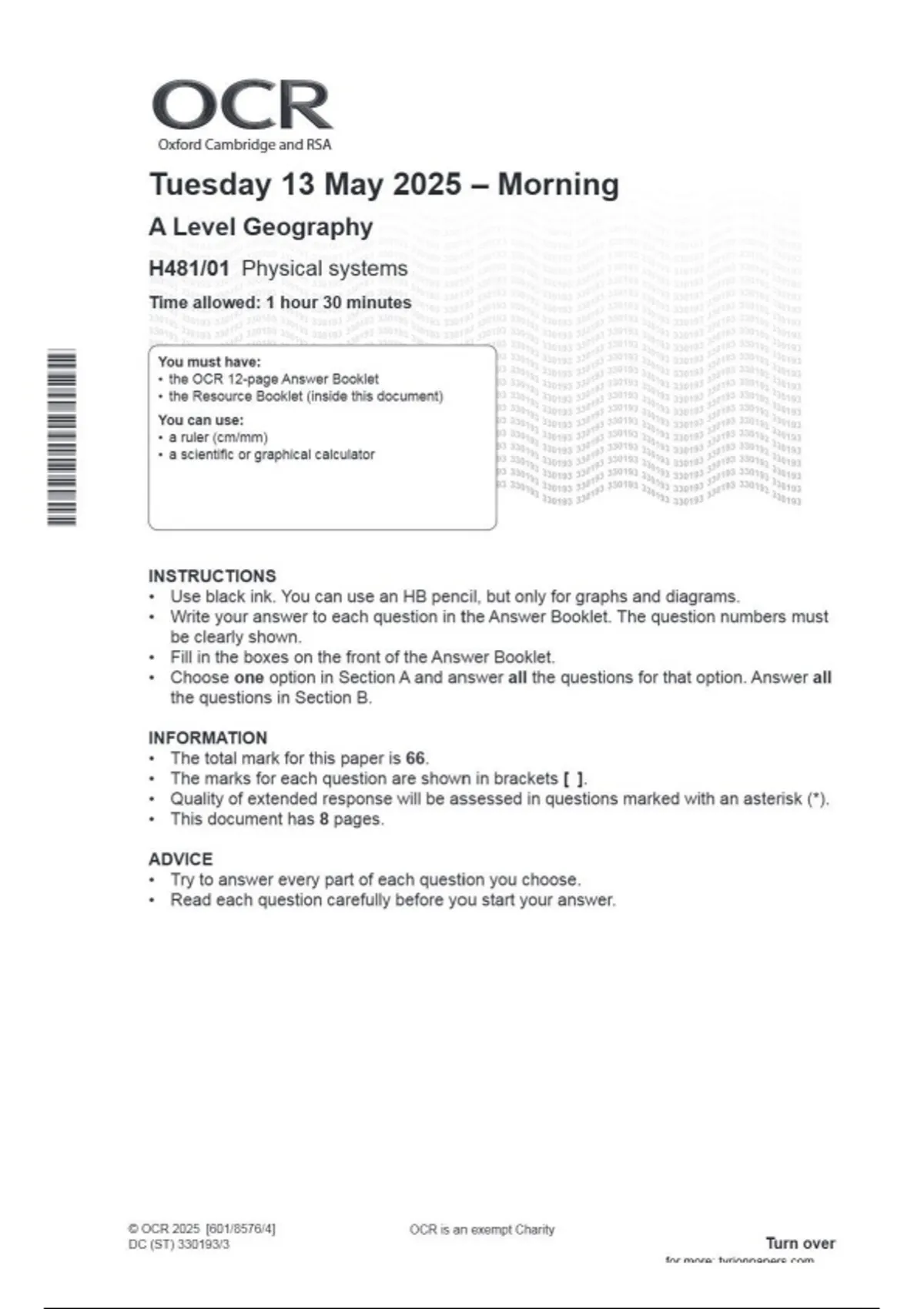 OCR A Level Geography H481/01 Physical systems JUNE 2025