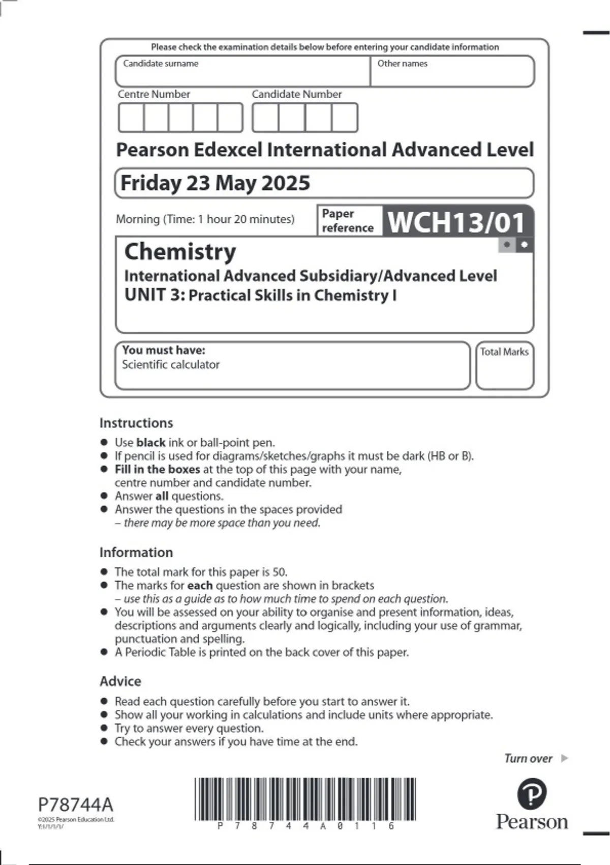 Pearson Edexcel International Advanced Subsidiary Level In Chemistry (WCH13) Paper 01 Practical Skills in Chemistry I may 2025