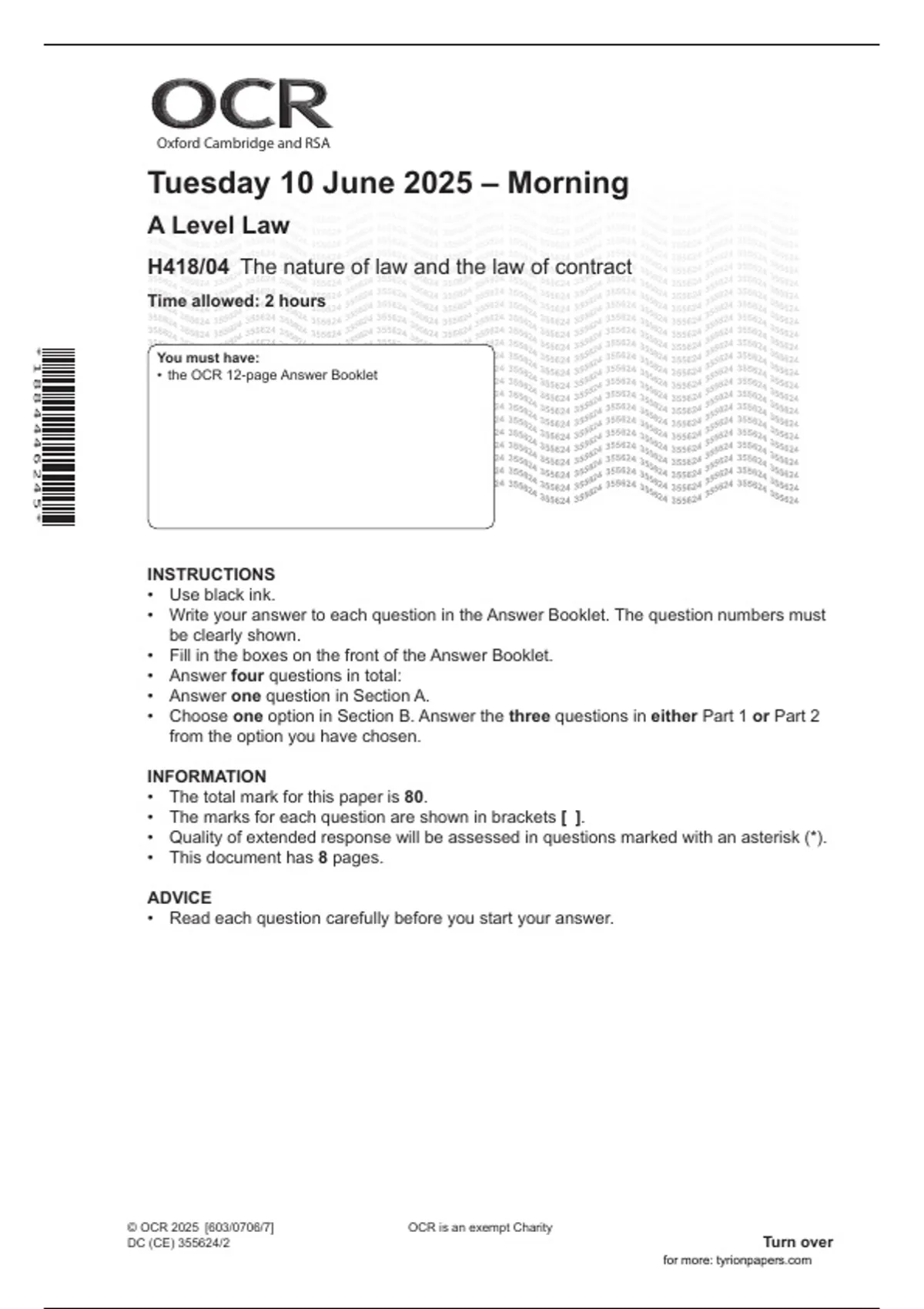 OCR A LEVEL 2025 LAW Paper 4 QP + free study guide at end