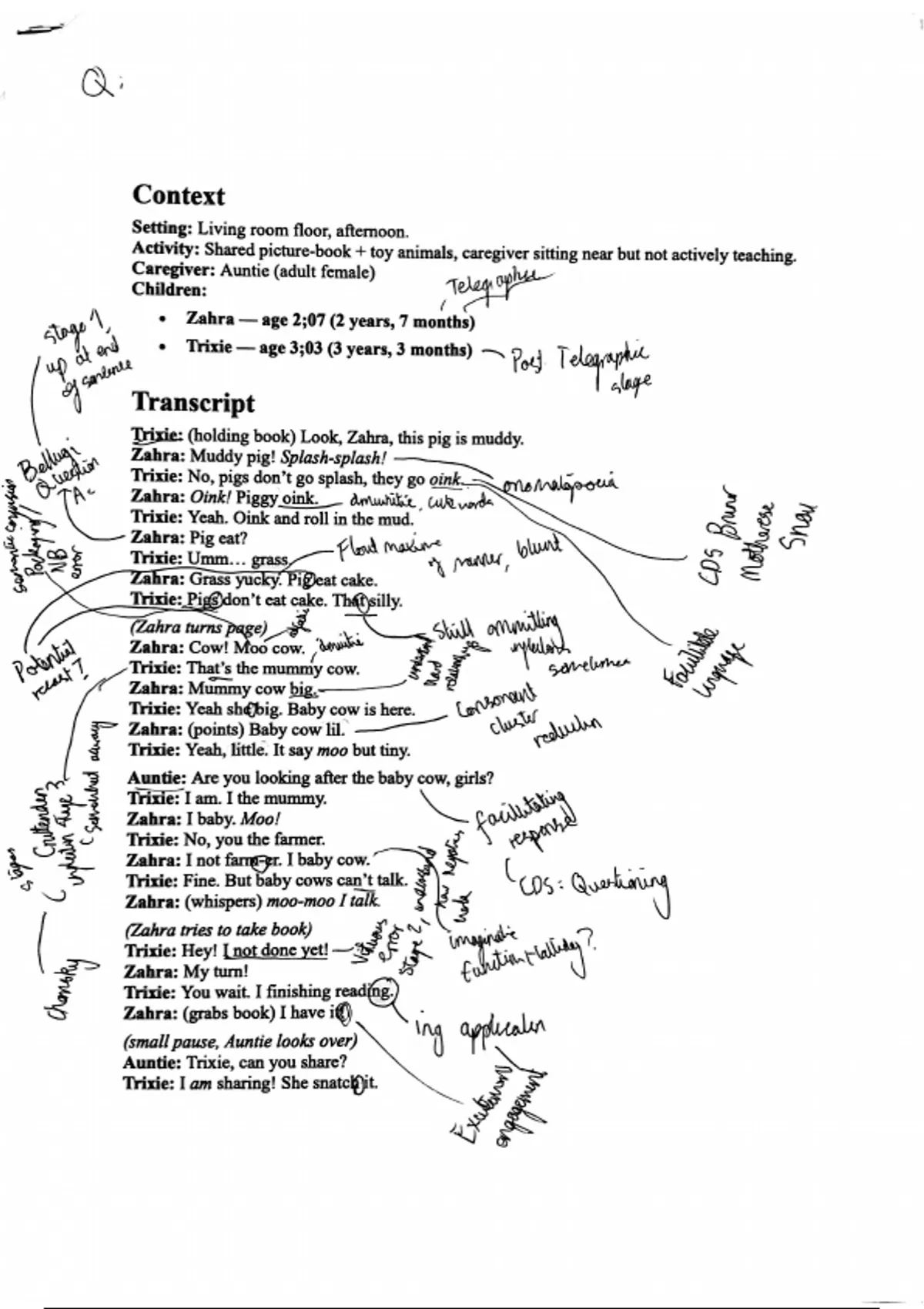 An annotated transcript for Child Language Acquisition A level that has been analysed by both teacher and student.