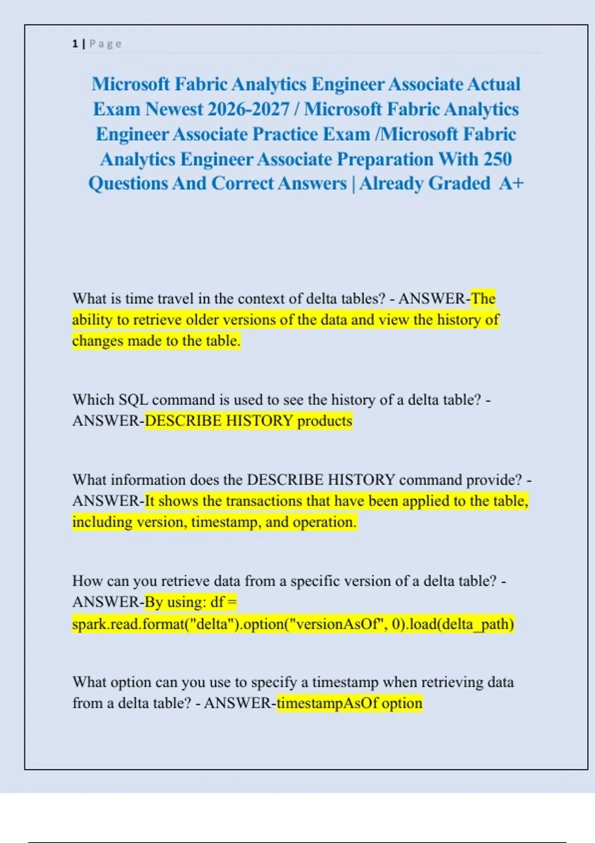 Microsoft Fabric Analytics Engineer Associate Actual Exam Newest / Microsoft Fabric Analytics Engineer Associate Practice Exam /Microsoft Fabric Analytics Engineer Associate Preparation With 250 Questions And Correct Answers | Already Graded
