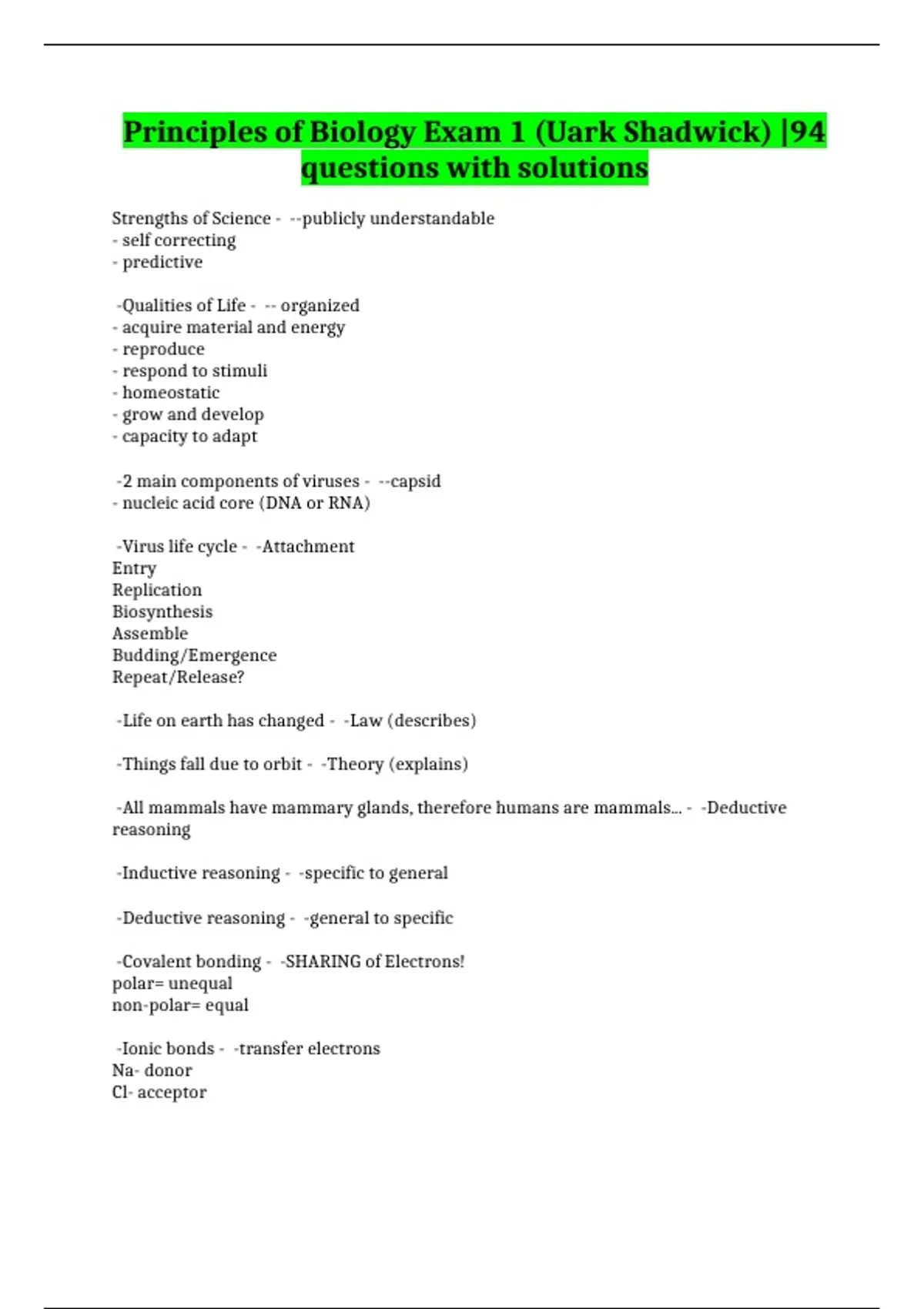 Principles of Biology Exam 1 (Uark Shadwick) |94
