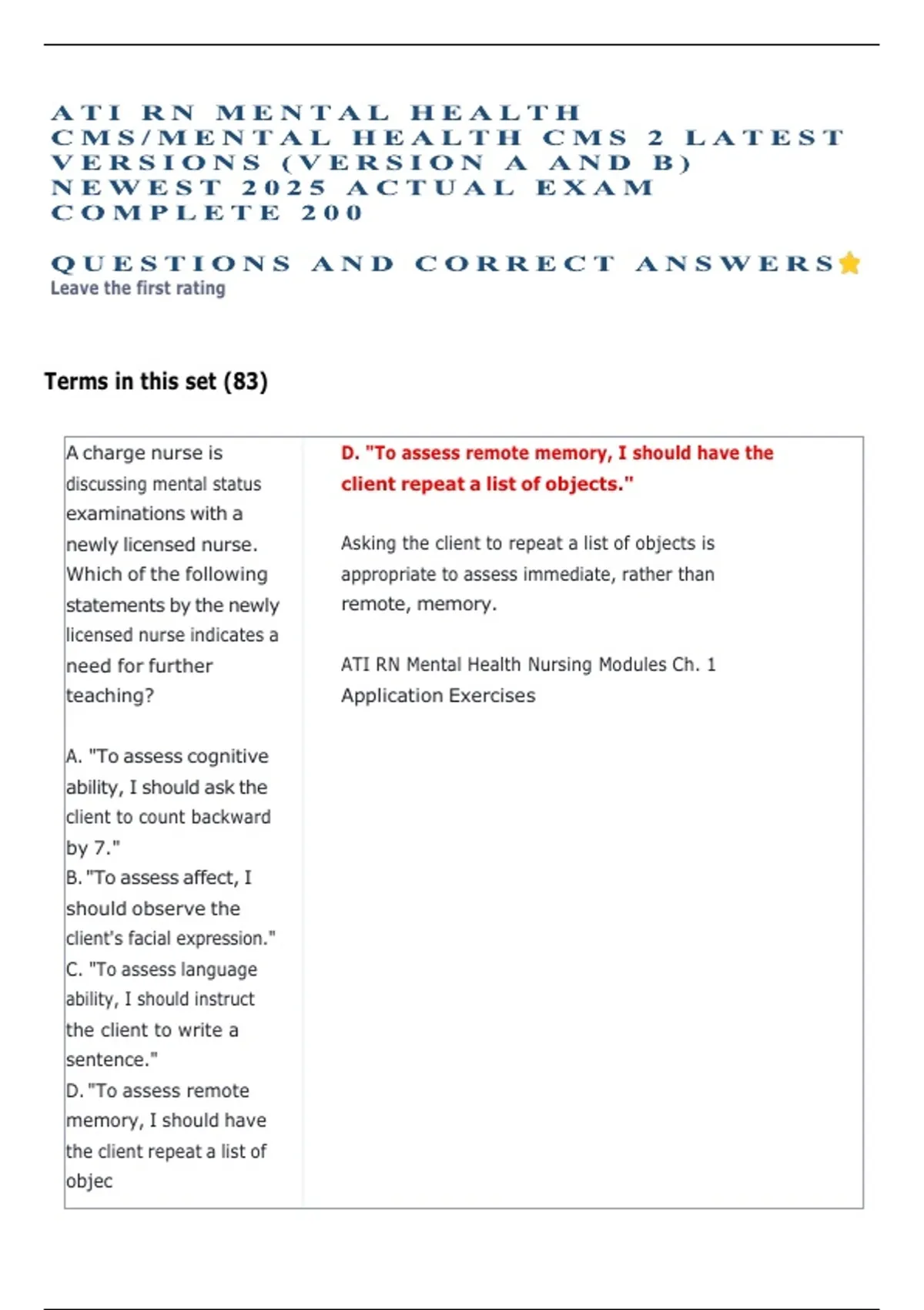 newly licensed nurse. Asking the client to repeat a list of objects is