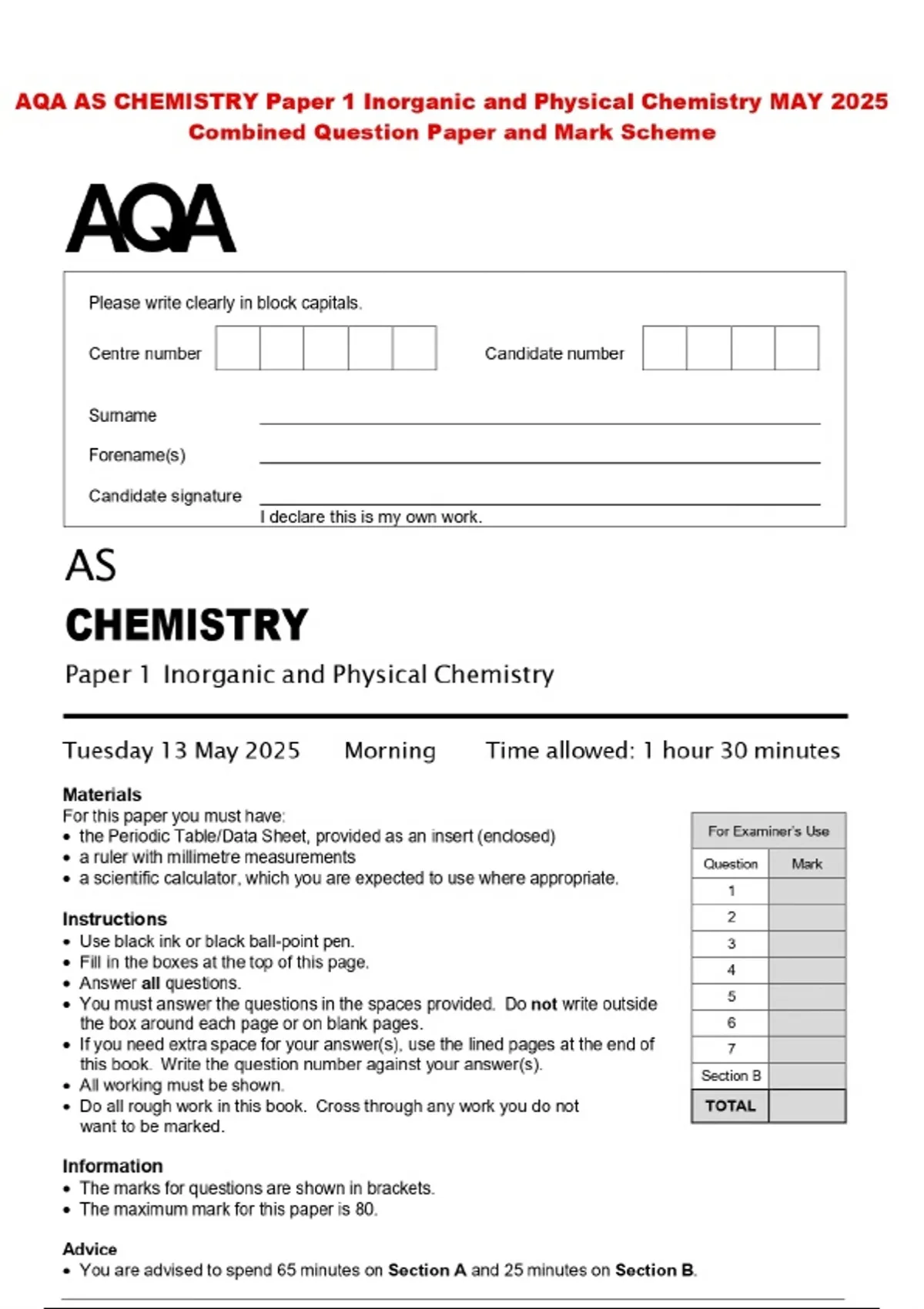 AQA AS CHEMISTRY Paper 1 Inorganic and Physical Chemistry MAY 2025 Combined Question Paper and Mark Scheme
