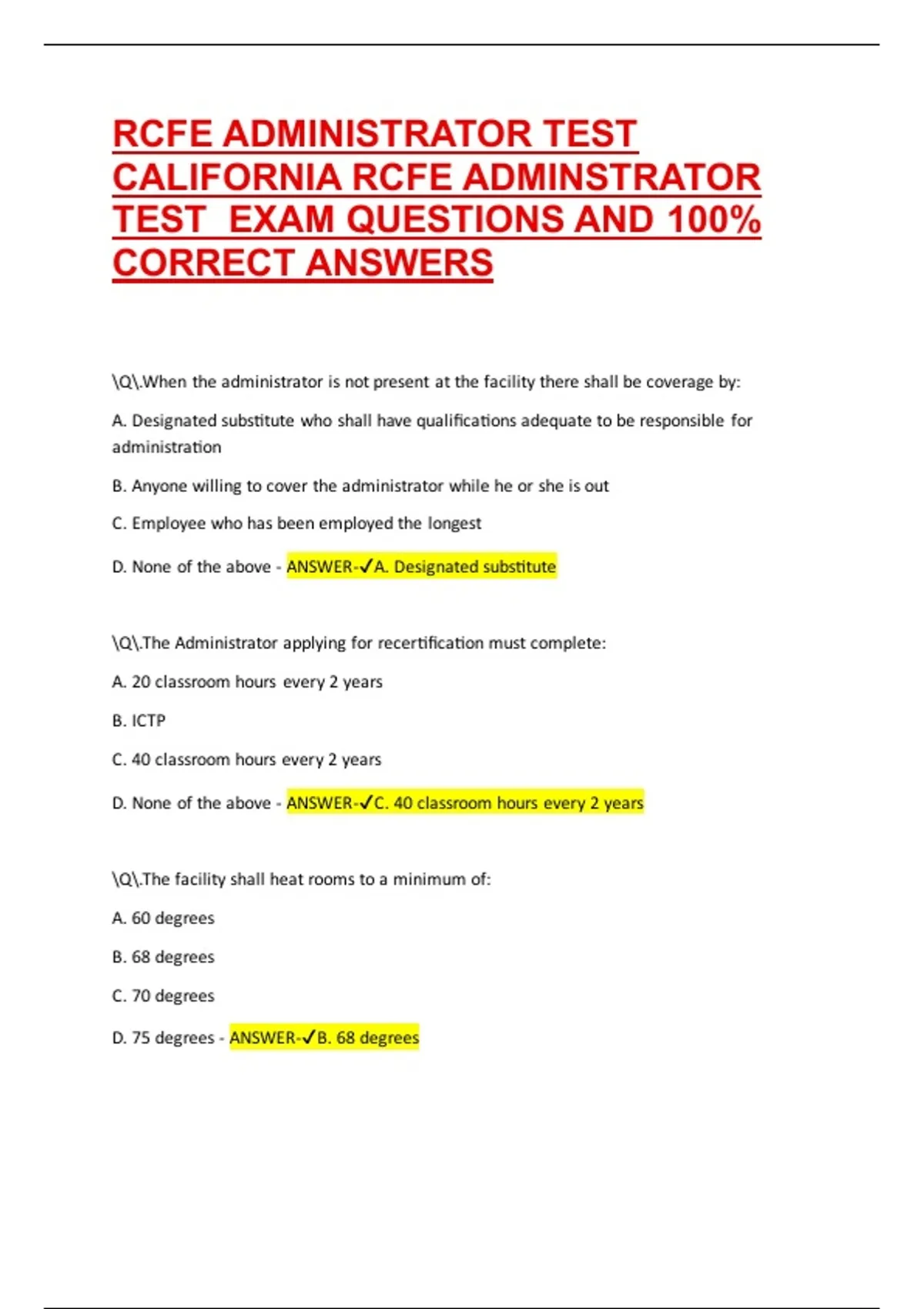 RCFE ADMINISTRATOR TEST CALIFORNIA RCFE ADMINSTRATOR TEST EXAM QUESTIONS AND 100% CORRECT ANSWERS Q.When the administrator is not present at the facility there shall be coverage by: A. Designated substitute who shall have qualifications adequate to be responsible for administration B. Anyone willing to cover the administrator while he or she is out C. Employee who has been employed the longest D. None of the above - ANSWER-A. Designated substitute Q.The Administrator applying for recertification must complete: A. 20 classroom hours every 2 years B. ICTP C. 40 classroom hours every 2 years D. None of the above - ANSWER-C. 40 classroom hours every 2 years Q.The facility shall heat rooms to a minimum of: A. 60 degrees B. 68 degrees C. 70 degrees D. 75 degrees - ANSWER-B. 68 degrees Q.To apply for recertification, the certificate holder must complete: A. A written request postmarked on or before the expiration date B. Evidence of completion of 40 CEU C. Payments of $100 processing fee D. All of the Above - ANSWER-D. All of the above Q.The Department of Social Services may revoke or deny any administrator certificate for violating regulations upon which of the following grounds: A. The administrator procured certificate by fraud or misrepresentation B. The administrator knowingly gave false statements in conjunction with the application of certification C. The department has issued an exclusion order against the holder D. All of the above - ANSWER-D. All of the above Q.Which one of the following individuals is not exempt from obtaining a criminal record clearance? A. Spouse visiting a client B. Licensed medical professionals not employed by the facility C. Family member residing in the facility D. Third party contractor retained by the facility - ANSWER-C. Family member residing in the facility Q.The plan of operation must include: A. Copy of the admission agreement B. Plan for training staff C. Administrative organization D. All of the above - ANSWER-D. All of the above Q.Every RCFE must have: A. Certified administrator B. Activity director C. Social worker D. All of the above - ANSWER-A. Certified administrator Q.All personnel records shall be kept for at least: A. 45 days B. 30 days C. 2 years D. 3 years - ANSWER-D. 3 years Q.The disaster and mass casualty plan must include: A. Transportation arrangements B. Names of licensed vocational nurses or registered nurses C. Names and ages of all the residents D. All of the above - ANSWER-A. Transportation arrangement Q.No licensee or employee shall: A. Accept appointment as a guardian/conservator B. Accept any special power of attorney C. Become joint tenants or any account with resident D. All of the above - ANSWER-D. All of the above Q.Each personnel record shall include:
