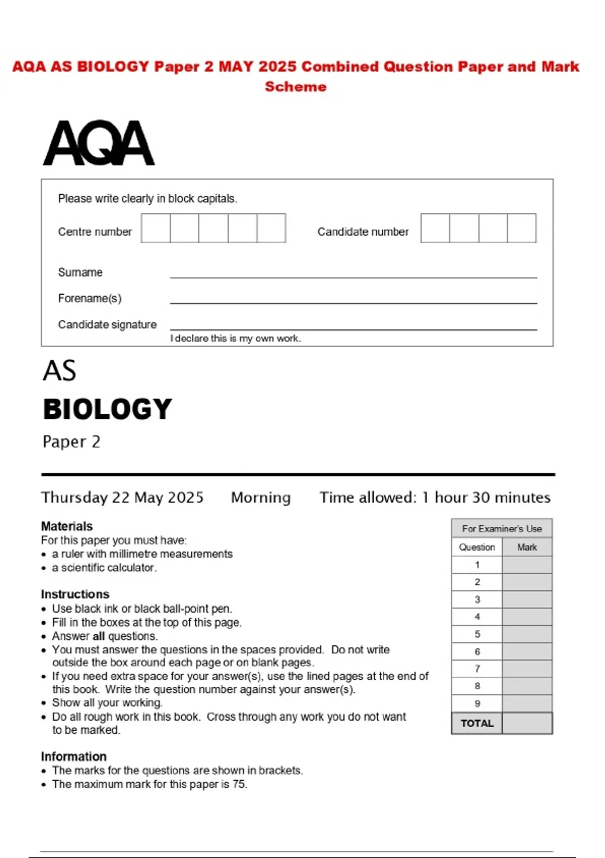 AQA AS BIOLOGY Paper 2 MAY 2025 Combined Question Paper and Mark Scheme
