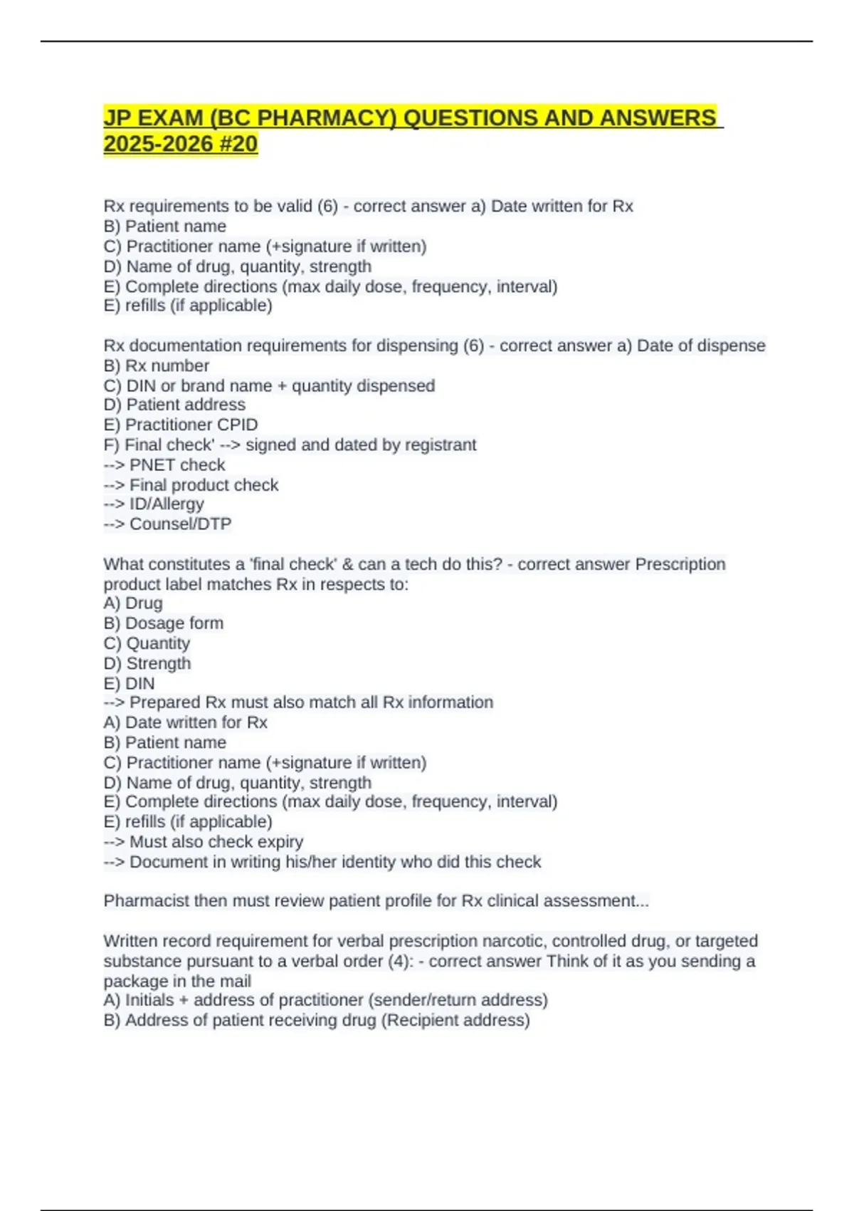 Written record for verbal Rx requirements (7) - correct answer a) Date transcribed