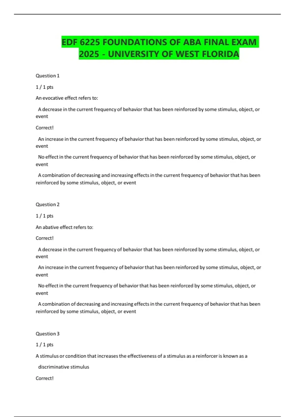 EDF 6225 FOUNDATIONS OF ABA FINAL EXAM 2025 - UNIVERSITY OF WEST FLORIDA