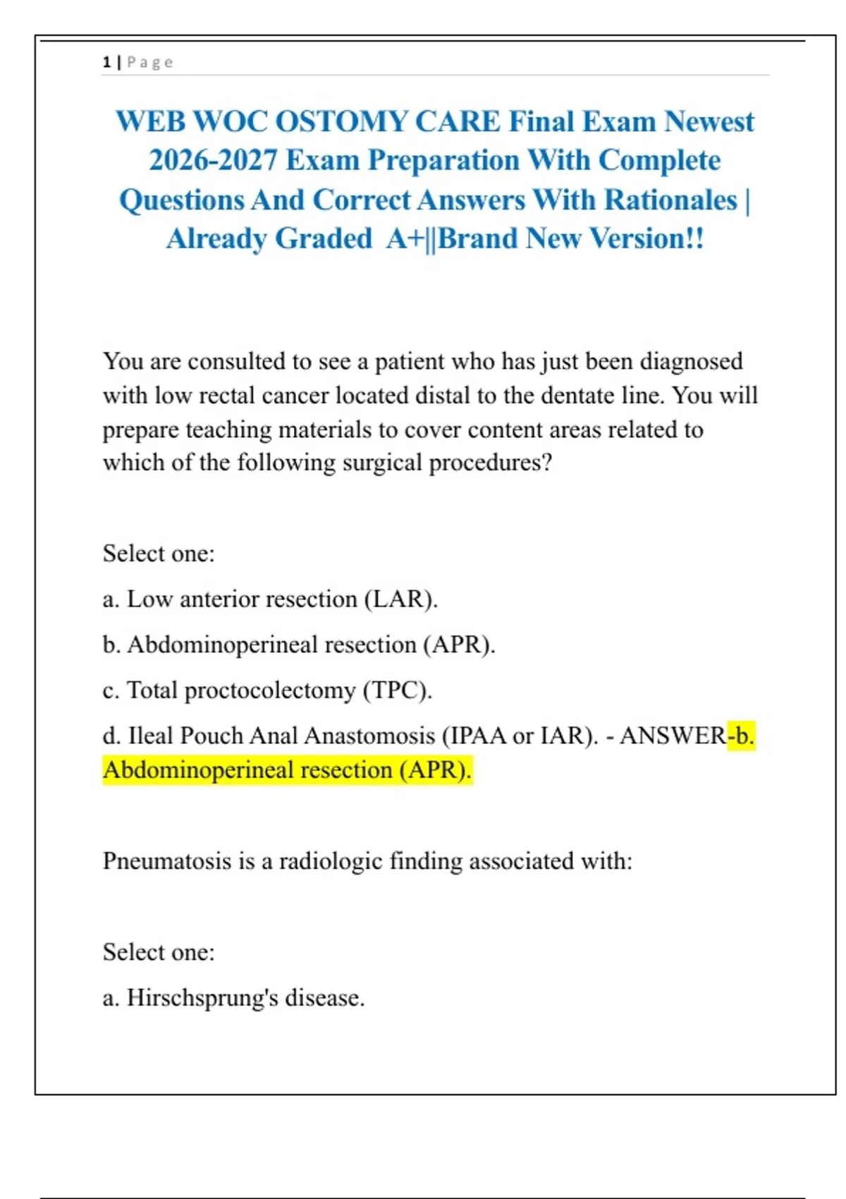 WEB WOC OSTOMY CARE Final Exam Newest Exam Preparation With Complete Questions And Correct Answers With Rationales | Already Graded A+||Brand New Version!!