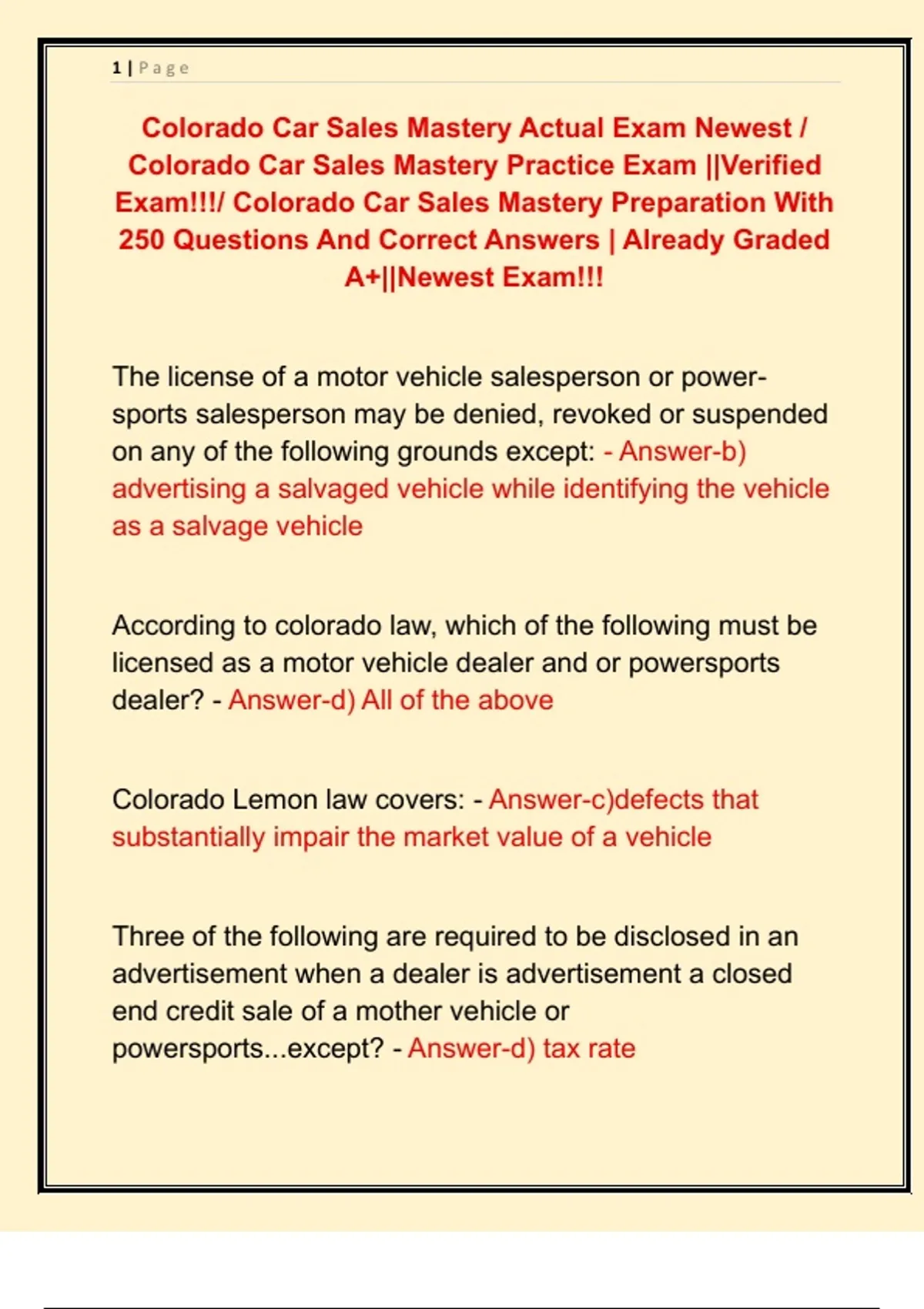 Exam!!!/ Colorado Car Sales Mastery Preparation With