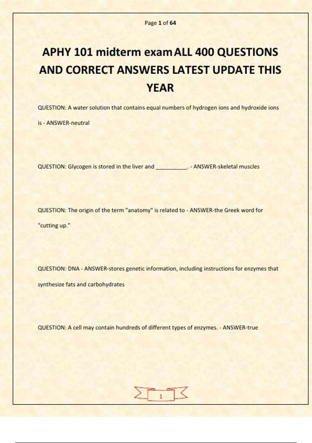 Tap on AVAILABLE IN BUNDLE/PACKAGE DEAL to unlock free bonus exams — save more while getting everything you need! You’ll be glad you did! The APHY 101 Final Exam – Complete 300 Questions and Verified Solutions 2026–2027 (Latest Update This Year) provides a fully updated and expertly verified collection of exam questions designed to help students master Anatomy and Physiology I concepts with confidence. This comprehensive resource covers key topics such as cellular organization, tissues, the integumentary, skeletal, muscular, and nervous systems, homeostasis, and fundamental physiological processes. Each question iTap on AVAILABLE IN BUNDLE/PACKAGE DEAL to unlock free bonus exams — save more while getting everything you need! You’ll be glad you did! The APHY 101 Midterm Exam – All 400 Questions and Correct Answers (Latest Update This Year) provides a fully updated and verified collection of exam questions designed to help students prepare confidently for their Anatomy and Physiology I midterm assessment. This comprehensive resource covers core topics such as cellular structure and function, tissues, the integumentary system, skeletal and muscular systems, basic nervous system concepts, and homeostasis. Each question includes the correct answer to reinforce understanding, improve knowledge retention, and enhance exam readiness. Ideal for APHY 101 students, this study tool ensures thorough preparation and boosts confidence for successful midterm exam es verified solutions to reinforce understanding, strengthen critical thinking, and enhance exam readiness. Ideal for APHY 101 students, this study tool ensures thorough preparation and supports successful performance on final examinations.