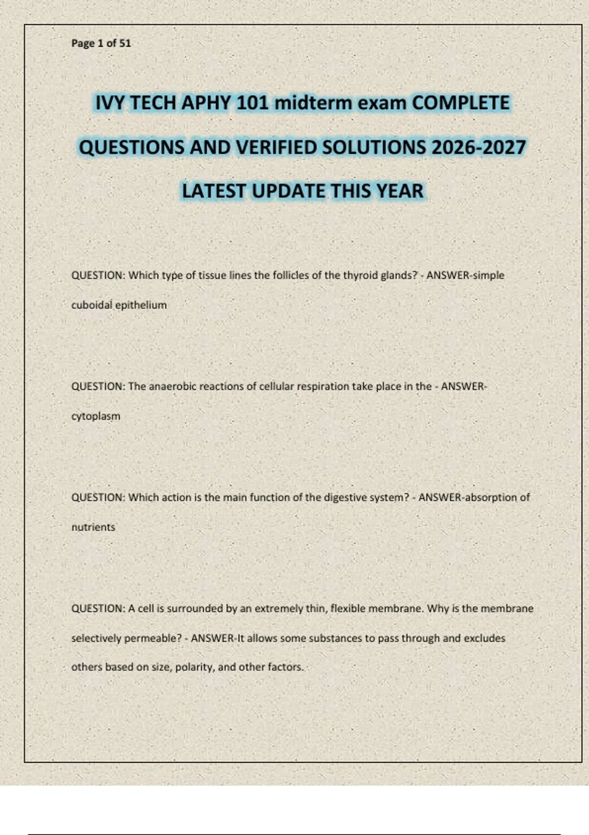 Tap on AVAILABLE IN BUNDLE/PACKAGE DEAL to unlock free bonus exams — save more while getting everything you need! You’ll be glad you did! The IVY TECH APHY 101 Midterm Exam – Complete Questions and Verified Solutions 2026–2027 (Latest Update This Year) provides a fully updated and expertly verified collection of exam questions designed to help students succeed in Anatomy and Physiology I midterm assessments at Ivy Tech. This comprehensive resource covers essential topics such as cellular organization, tissues, the integumentary system, skeletal and muscular systems, nervous system fundamentals, and homeostasis. Each question includes verified solutions to reinforce understanding, strengthen critical thinking, and enhance exam readiness. Ideal for APHY 101 students, this study tool ensures thorough preparation and builds confidence for successful midterm exam performance.