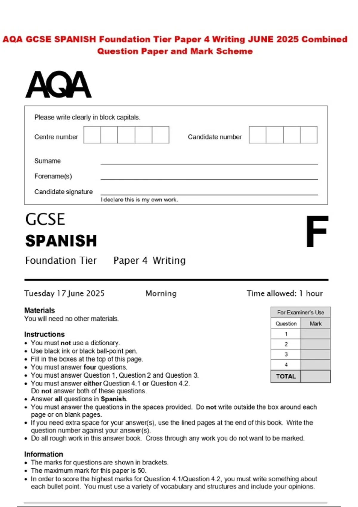 AQA GCSE SPANISH Foundation Tier Paper 4 Writing JUNE 2025 Combined Question Paper and Mark Scheme