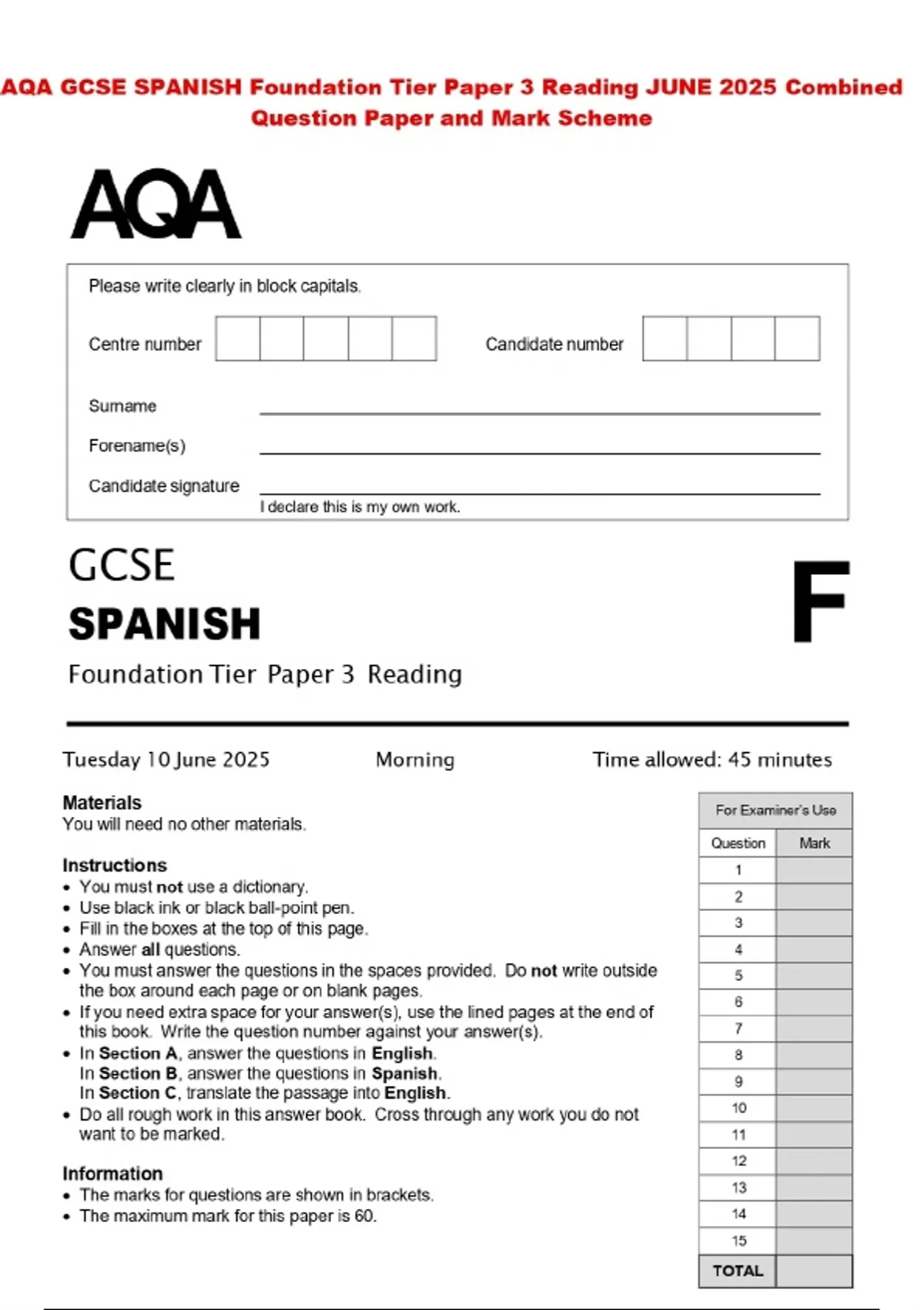 AQA GCSE SPANISH Foundation Tier Paper 3 Reading JUNE 2025 Combined Question Paper and Mark Scheme