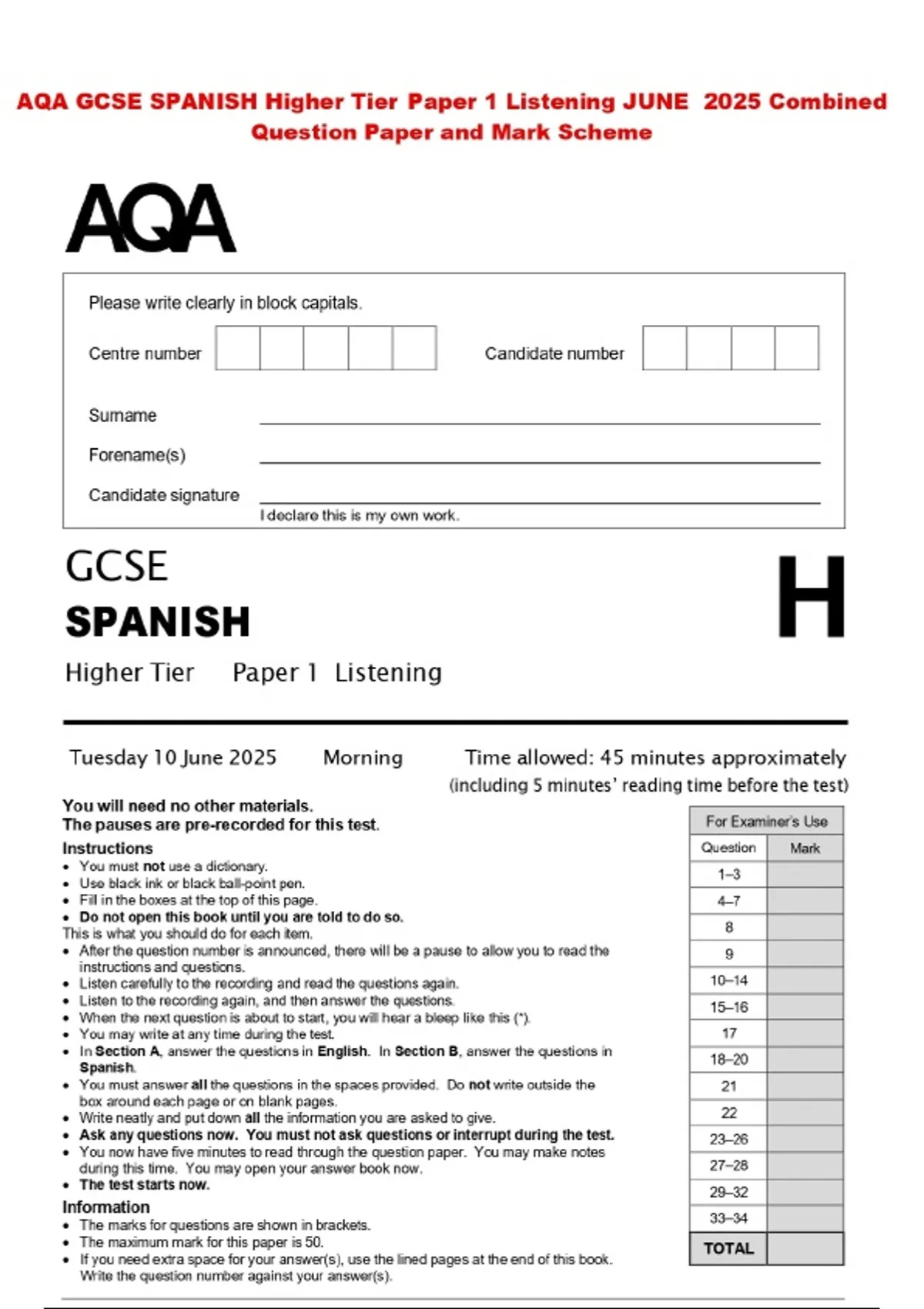 AQA GCSE SPANISH Higher Tier Paper 1 Listening JUNE 2025 Combined Question Paper and Mark Scheme