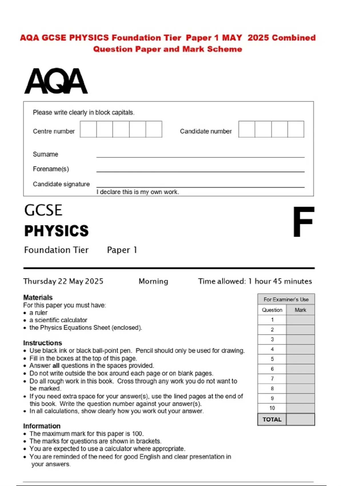 AQA GCSE PHYSICS Foundation Tier Paper 1 MAY 2025 Combined Question Paper and Mark Scheme
