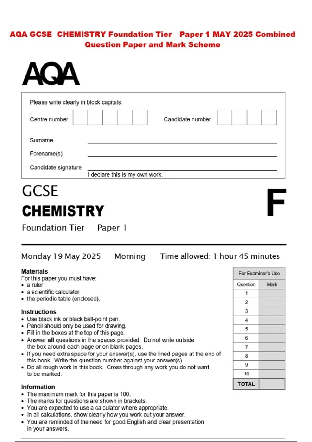 AQA GCSE CHEMISTRY Foundation Tier Paper 1 MAY 2025 Combined Question Paper and Mark Scheme