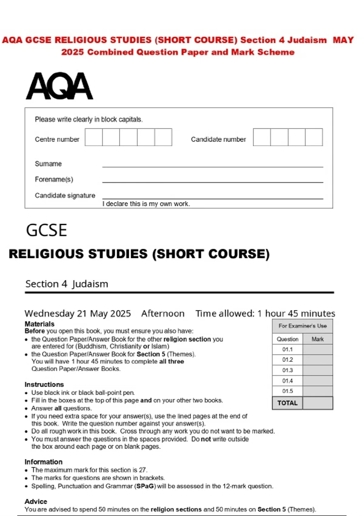 AQA GCSE RELIGIOUS STUDIES (SHORT COURSE) Section 4 Judaism MAY 2025 Combined Question Paper and Mark Scheme