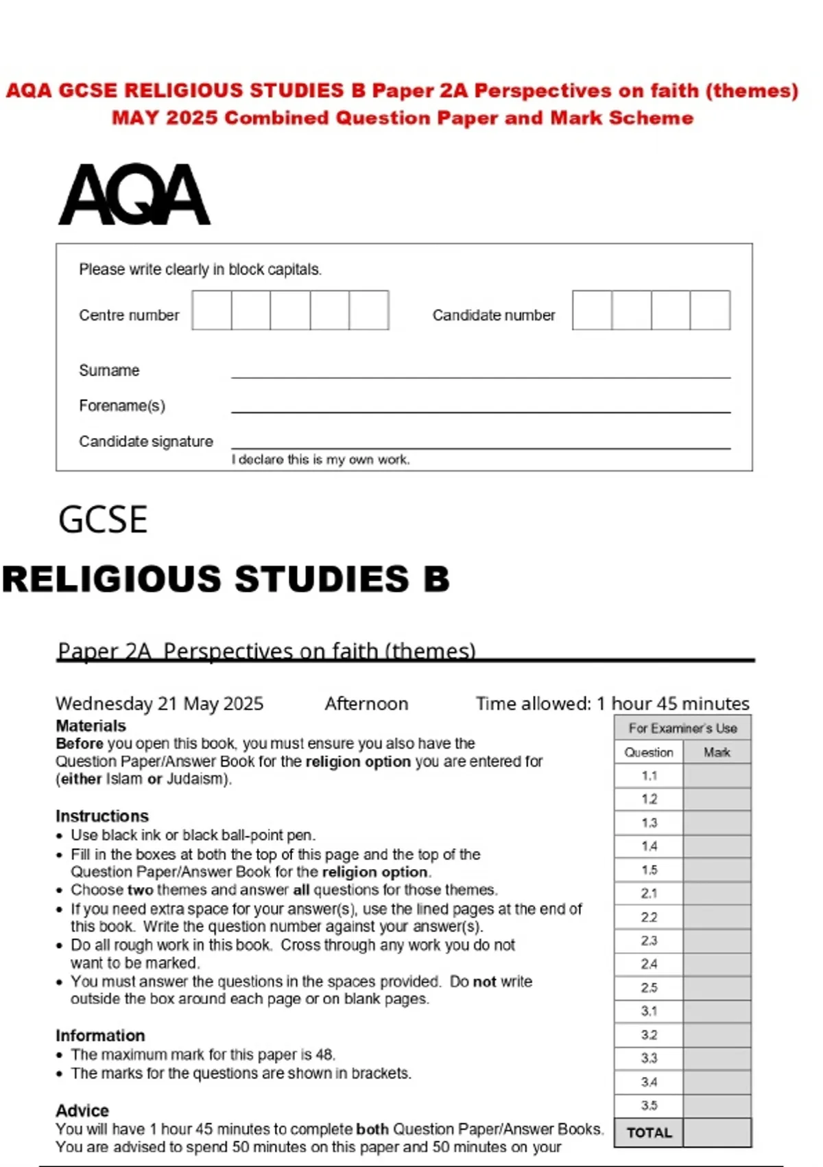 AQA GCSE RELIGIOUS STUDIES B Paper 2A Perspectives on faith (themes) MAY 2025 Combined Question Paper and Mark Scheme