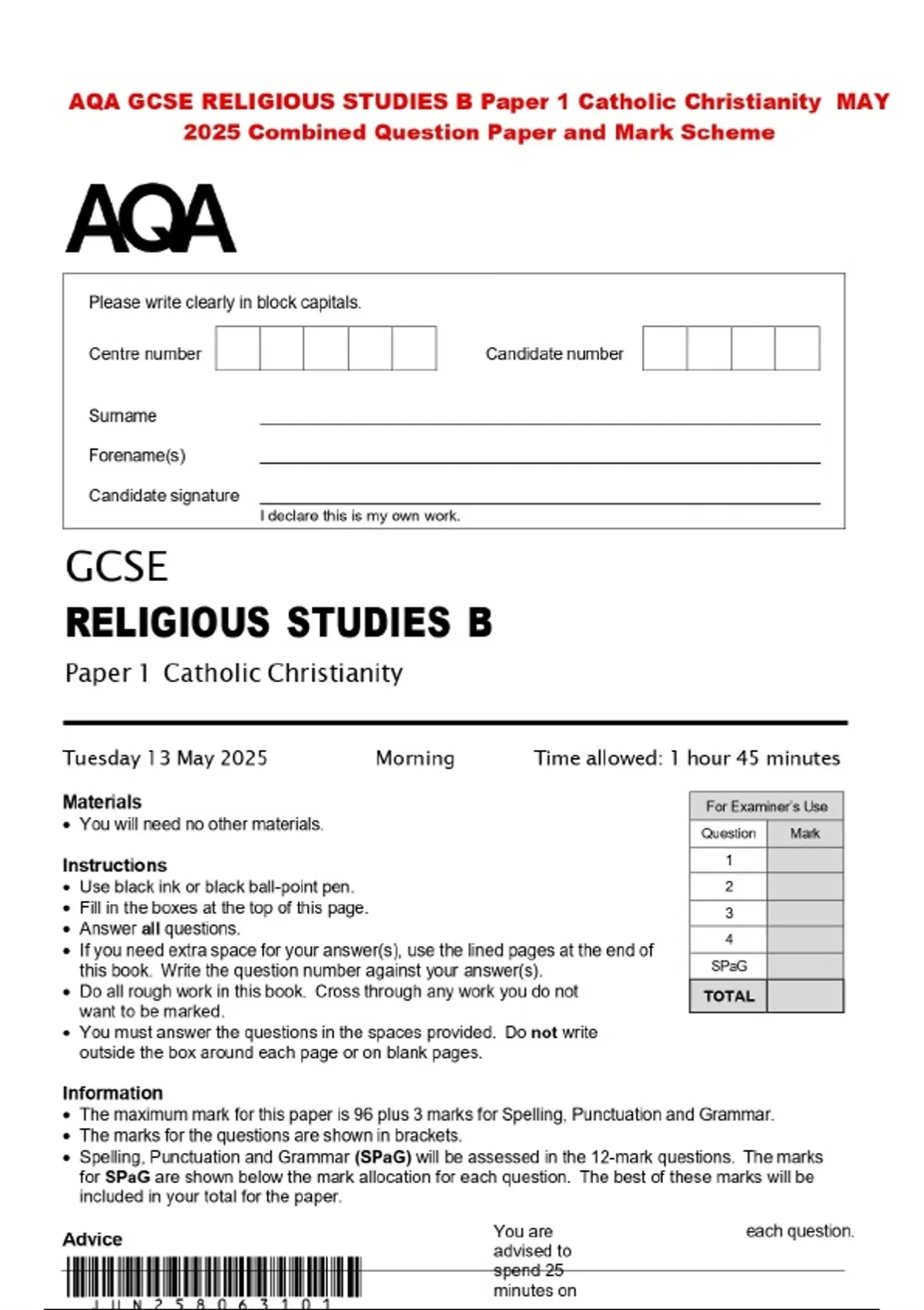 AQA GCSE RELIGIOUS STUDIES B Paper 1 Catholic Christianity MAY 2025 Combined Question Paper and Mark Scheme