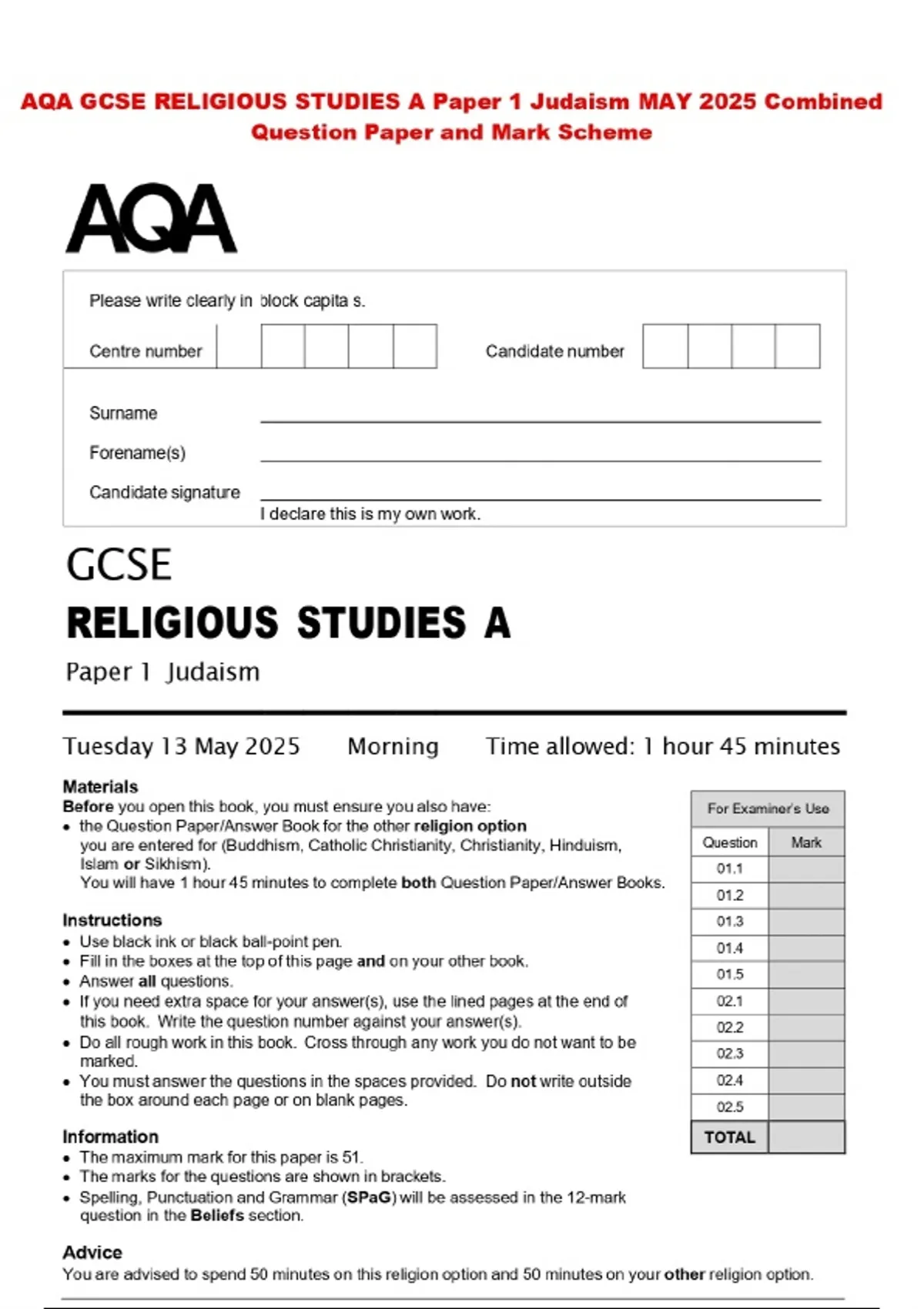 AQA GCSE RELIGIOUS STUDIES A Paper 1 Judaism MAY 2025 Combined Question Paper and Mark Scheme