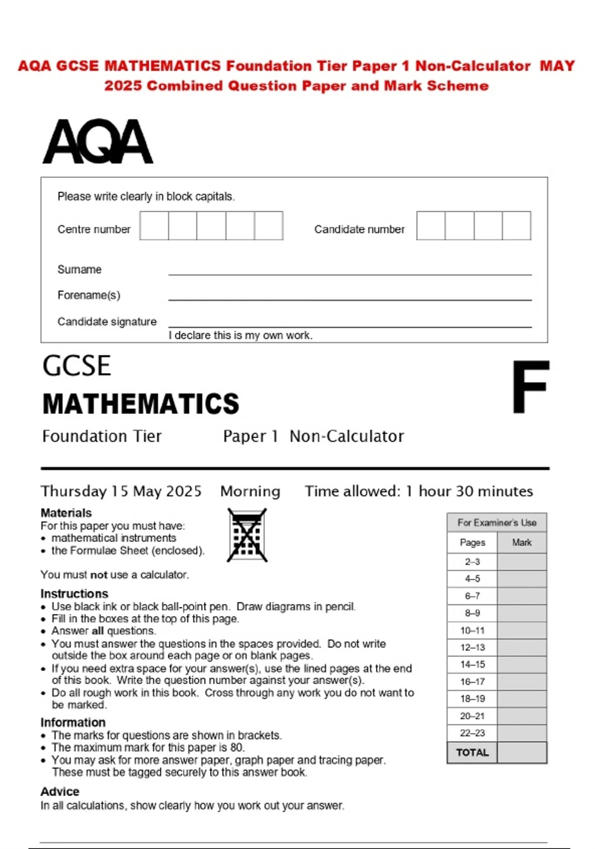 AQA GCSE MATHEMATICS Foundation Tier Paper 1 Non-Calculator MAY 2025 Combined Question Paper and Mark Scheme