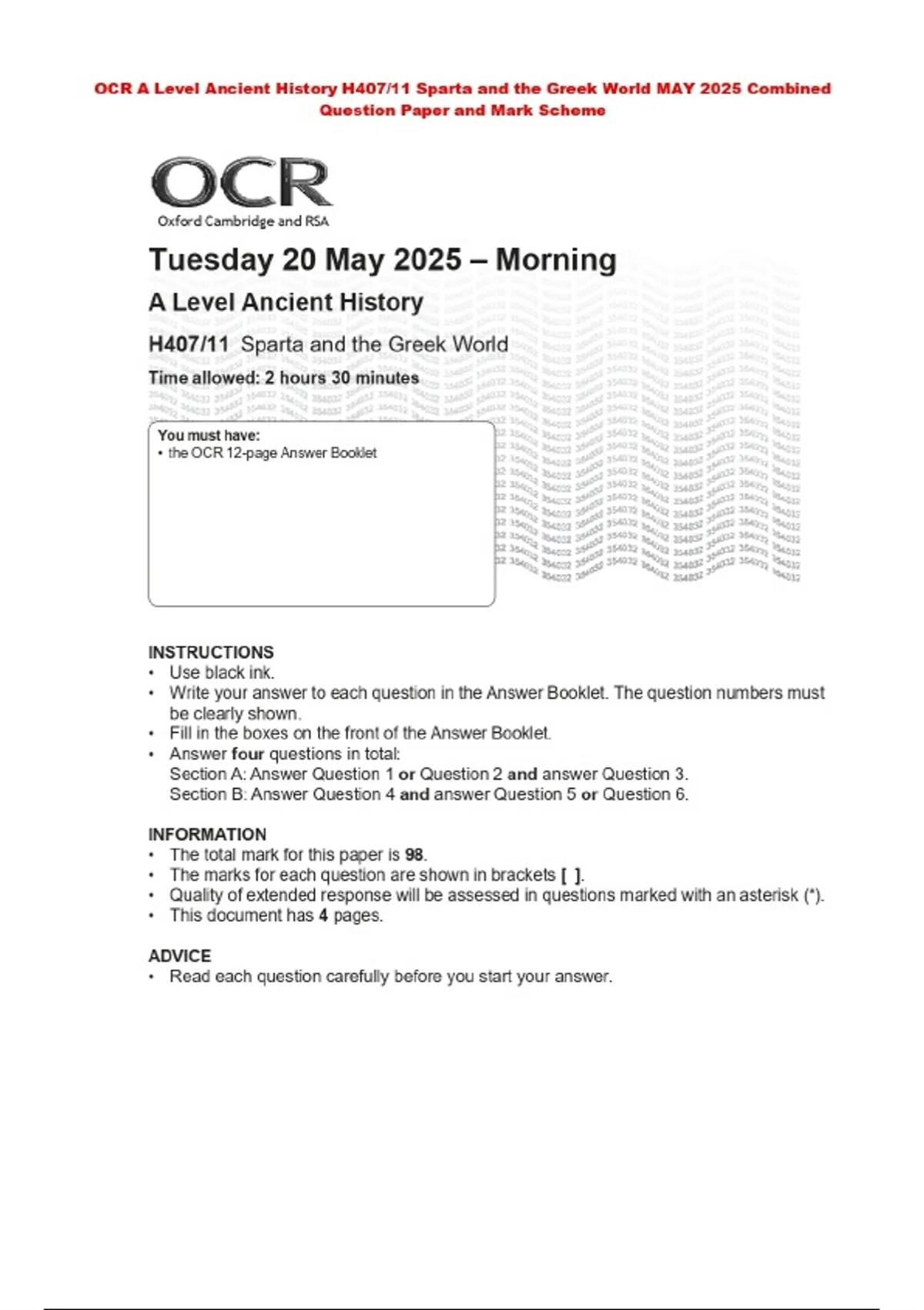 OCR A Level Ancient History H407/11 Sparta and the Greek World MAY 2025 Combined Question Paper and Mark Scheme