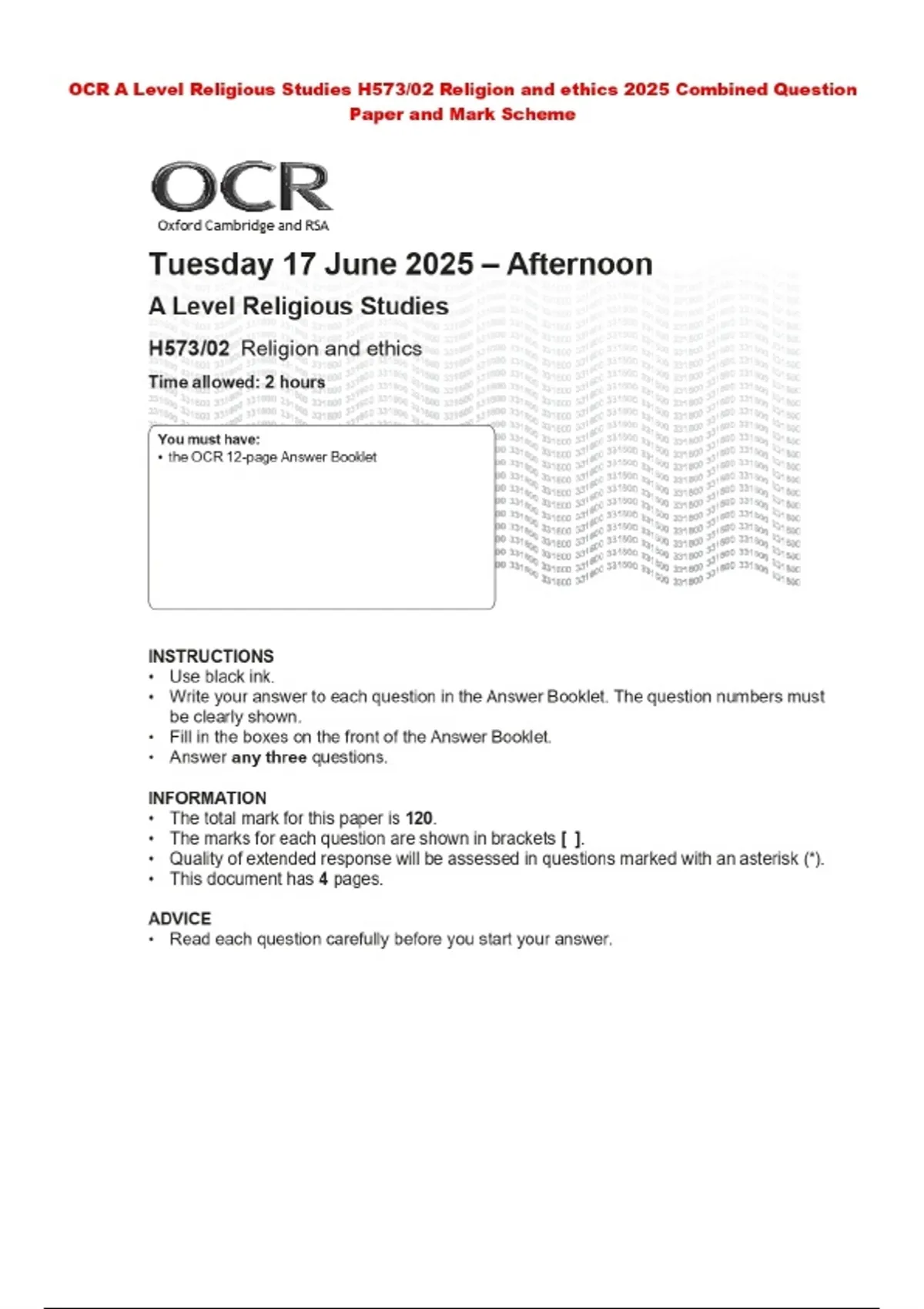 OCR A Level Religious Studies H573/02 Religion and ethics 2025 Combined Question Paper and Mark Scheme