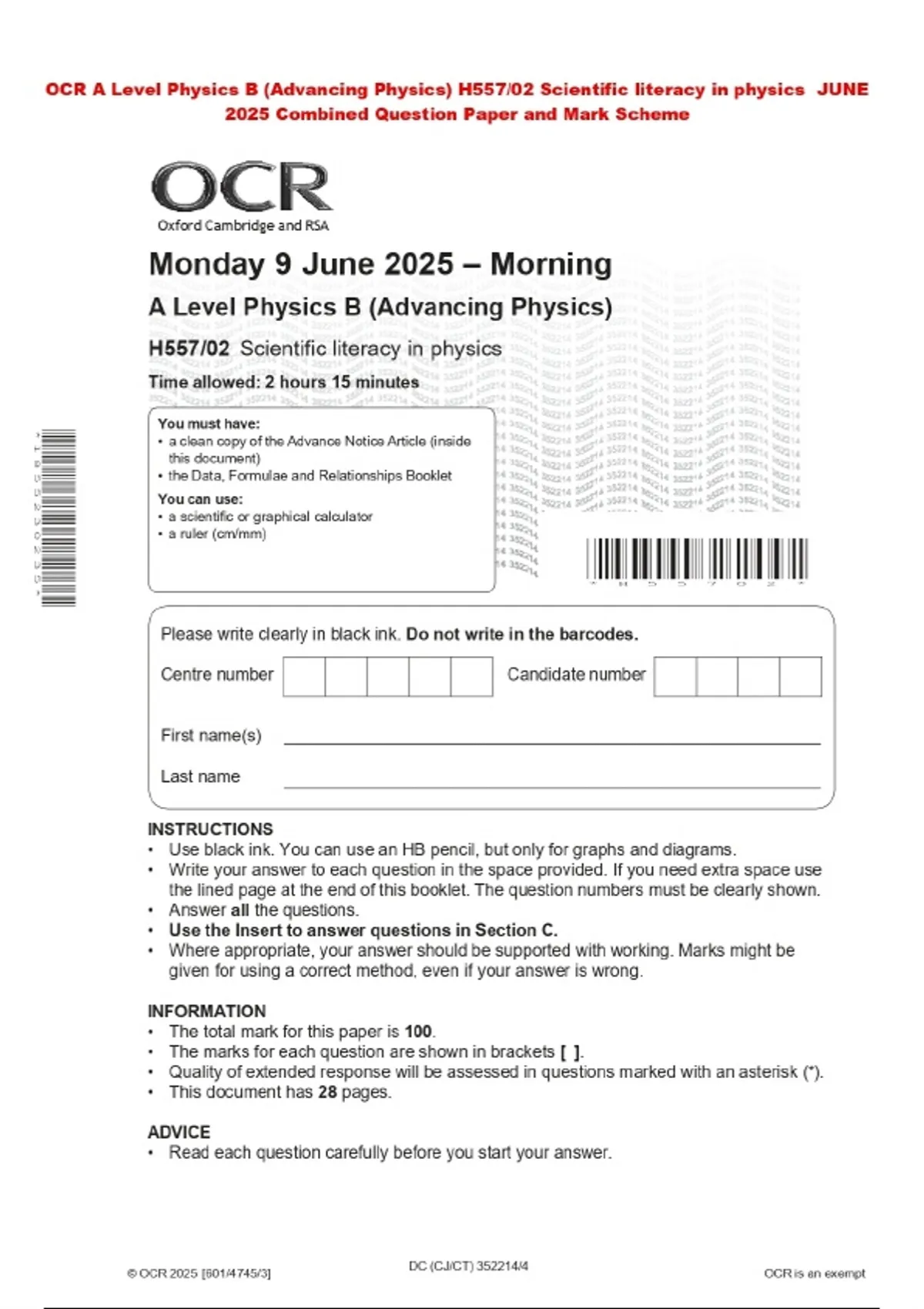 OCR A Level Physics B (Advancing Physics) H557/02 Scientific literacy in physics JUNE 2025 Combined Question Paper and Mark Scheme