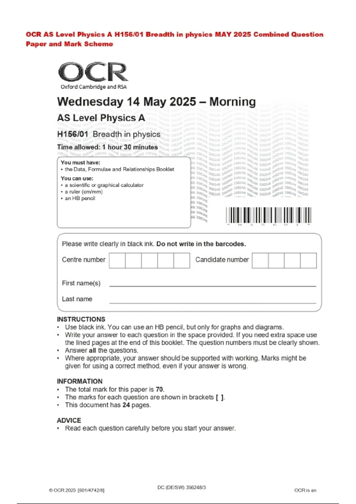OCR AS Level Physics A H156/01 Breadth in physics MAY 2025 Combined Question Paper and Mark Scheme