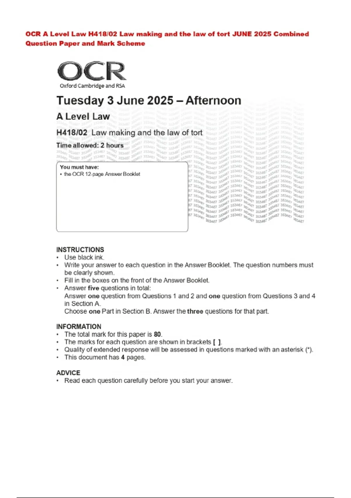 OCR A Level Law H418/02 Law making and the law of tort JUNE 2025 Combined Question Paper and Mark Scheme