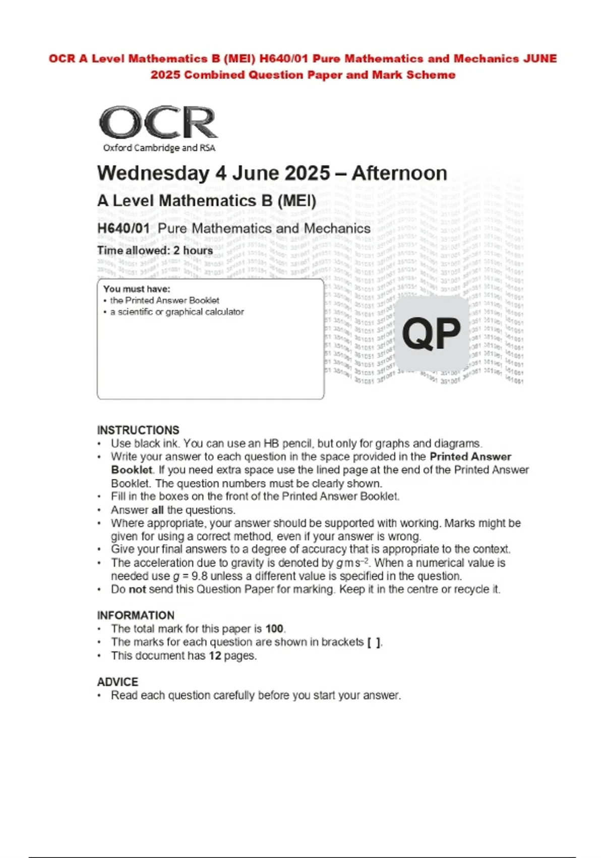 OCR A Level Mathematics B (MEI) H640/01 Pure Mathematics and Mechanics JUNE 2025 Combined Question Paper and Mark Scheme