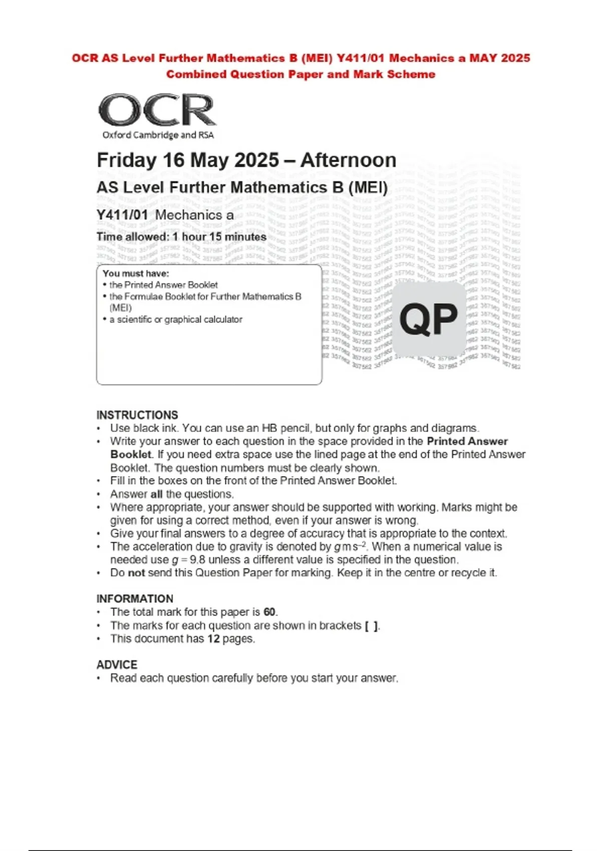 BUNDLE::: OCR AS Level Mathematics 2025 Combined Question Paper and Mark Scheme