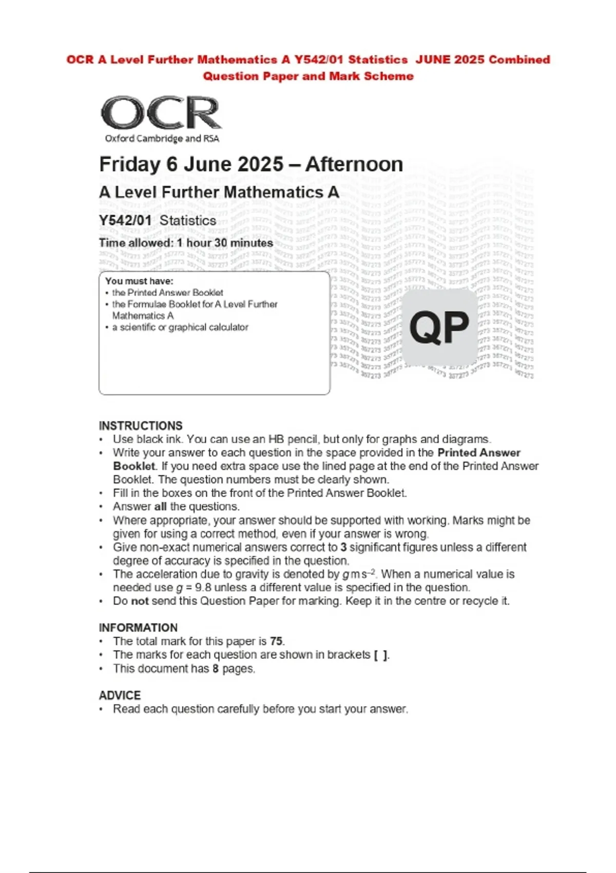 OCR A Level Further Mathematics A Y542/01 Statistics JUNE 2025 Combined Question Paper and Mark Scheme