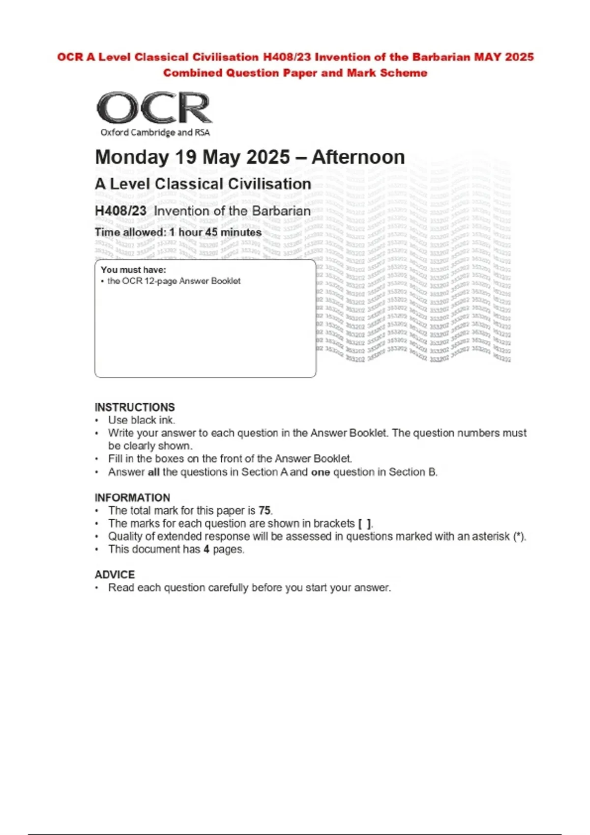 OCR A Level Classical Civilisation H408/23 Invention of the Barbarian MAY 2025 Combined Question Paper and Mark Scheme
