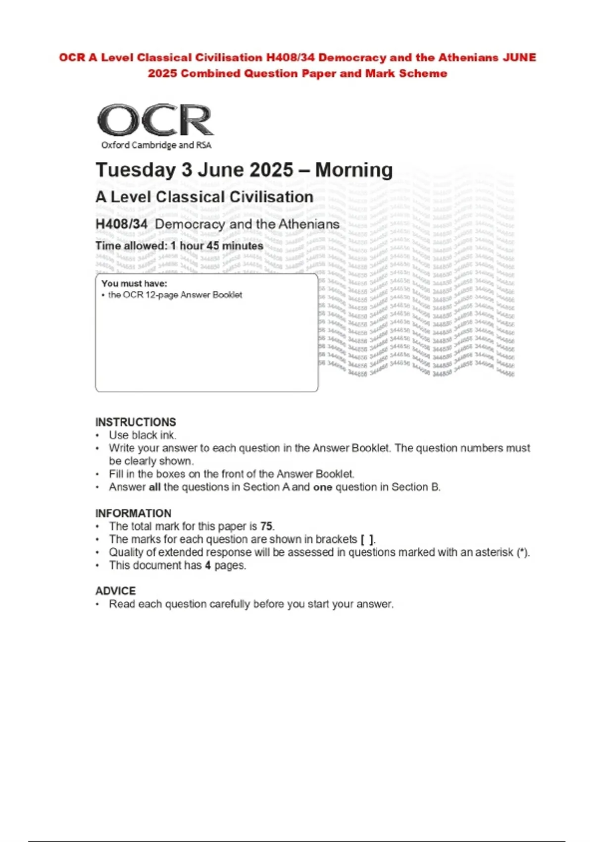 OCR A Level Classical Civilisation H408/34 Democracy and the Athenians JUNE 2025 Combined Question Paper and Mark Scheme